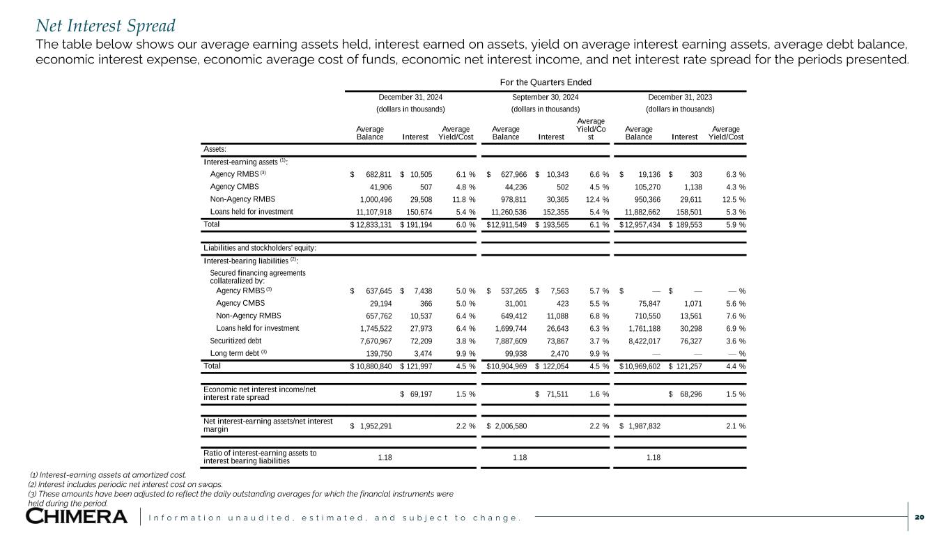 I n f o r m a t i o n u n a u d i t e d , e s t i m a t e d , a n d s u b j e c t t o c h a n g e . Net Interest Spread The table below shows our average earning assets held, interest earned on assets, yield on average interest earning assets, average debt balance, economic interest expense, economic average cost of funds, economic net interest income, and net interest rate spread for the periods presented. 20 For the Quarters Ended December 31, 2024 September 30, 2024 December 31, 2023 (dollars in thousands) (dollars in thousands) (dollars in thousands) Average Balance Interest Average Yield/Cost Average Balance Interest Average Yield/Co st Average Balance Interest Average Yield/Cost Assets: Interest-earning assets (1): Agency RMBS (3) $ 682,811 $ 10,505 6.1 % $ 627,966 $ 10,343 6.6 % $ 19,136 $ 303 6.3 % Agency CMBS 41,906 507 4.8 % 44,236 502 4.5 % 105,270 1,138 4.3 % Non-Agency RMBS 1,000,496 29,508 11.8 % 978,811 30,365 12.4 % 950,366 29,611 12.5 % Loans held for investment 11,107,918 150,674 5.4 % 11,260,536 152,355 5.4 % 11,882,662 158,501 5.3 % Total $ 12,833,131 $ 191,194 6.0 % $ 12,911,549 $ 193,565 6.1 % $ 12,957,434 $ 189,553 5.9 % Liabilities and stockholders' equity: Interest-bearing liabilities (2): Secured financing agreements collateralized by: Agency RMBS (3) $ 637,645 $ 7,438 5.0 % $ 537,265 $ 7,563 5.7 % $ — $ — — % Agency CMBS 29,194 366 5.0 % 31,001 423 5.5 % 75,847 1,071 5.6 % Non-Agency RMBS 657,762 10,537 6.4 % 649,412 11,088 6.8 % 710,550 13,561 7.6 % Loans held for investment 1,745,522 27,973 6.4 % 1,699,744 26,643 6.3 % 1,761,188 30,298 6.9 % Securitized debt 7,670,967 72,209 3.8 % 7,887,609 73,867 3.7 % 8,422,017 76,327 3.6 % Long term debt (3) 139,750 3,474 9.9 % 99,938 2,470 9.9 % — — — % Total $ 10,880,840 $ 121,997 4.5 % $ 10,904,969 $ 122,054 4.5 % $ 10,969,602 $ 121,257 4.4 % Economic net interest income/net interest rate spread $ 69,197 1.5 % $ 71,511 1.6 % $ 68,296 1.5 % Net interest-earning assets/net interest margin $ 1,952,291 2.2 % $ 2,006,580 2.2 % $ 1,987,832 2.1 % Ratio of interest-earning assets to interest bearing liabilities 1.18 1.18 1.18 (1) Interest-earning assets at amortized cost. (2) Interest includes periodic net interest cost on swaps. (3) These amounts have been adjusted to reflect the daily outstanding averages for which the financial instruments were held during the period.
