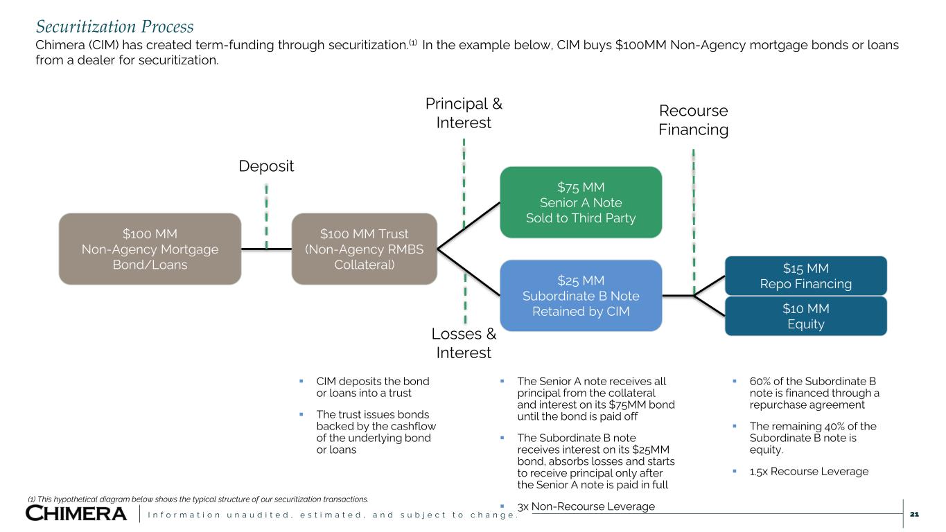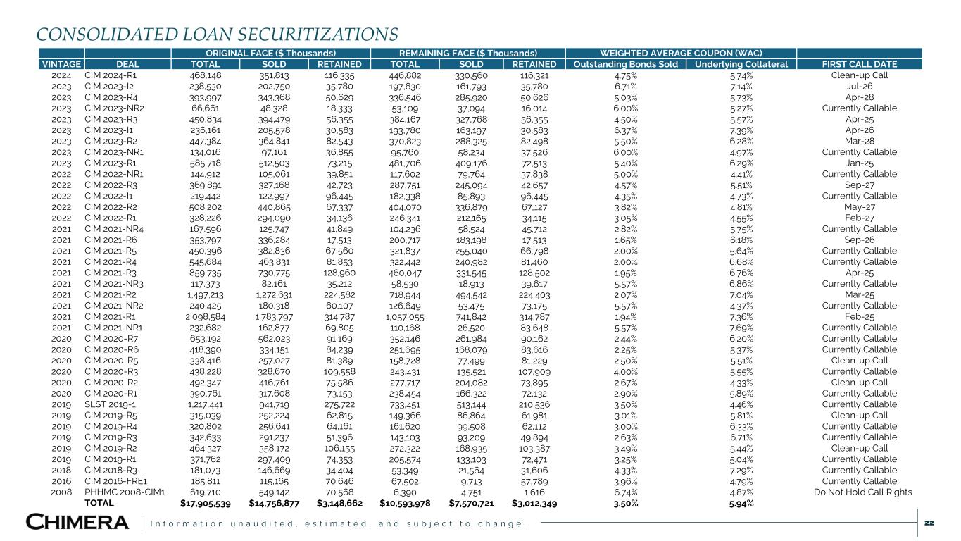 I n f o r m a t i o n u n a u d i t e d , e s t i m a t e d , a n d s u b j e c t t o c h a n g e . $100 MM Non-Agency Mortgage Bond/Loans $100 MM Trust (Non-Agency RMBS Collateral) $75 MM Senior A Note Sold to Third Party $25 MM Subordinate B Note Retained by CIM $15 MM Repo Financing $10 MM Equity Deposit Principal & Interest Losses & Interest Recourse Financing ▪ CIM deposits the bond or loans into a trust ▪ The trust issues bonds backed by the cashflow of the underlying bond or loans ▪ The Senior A note receives all principal from the collateral and interest on its $75MM bond until the bond is paid off ▪ The Subordinate B note receives interest on its $25MM bond, absorbs losses and starts to receive principal only after the Senior A note is paid in full ▪ 3x Non-Recourse Leverage ▪ 60% of the Subordinate B note is financed through a repurchase agreement ▪ The remaining 40% of the Subordinate B note is equity. ▪ 1.5x Recourse Leverage Securitization Process Chimera (CIM) has created term-funding through securitization.(1) In the example below, CIM buys $100MM Non-Agency mortgage bonds or loans from a dealer for securitization. 21 (1) This hypothetical diagram below shows the typical structure of our securitization transactions.