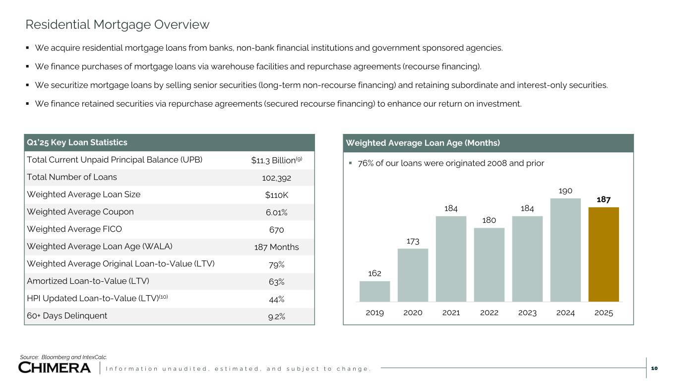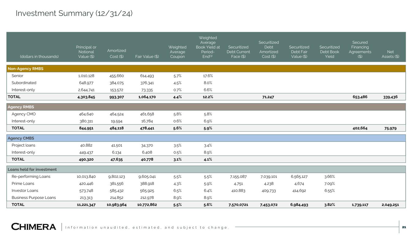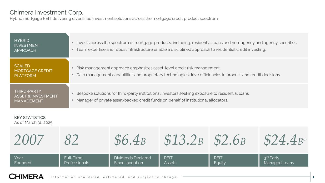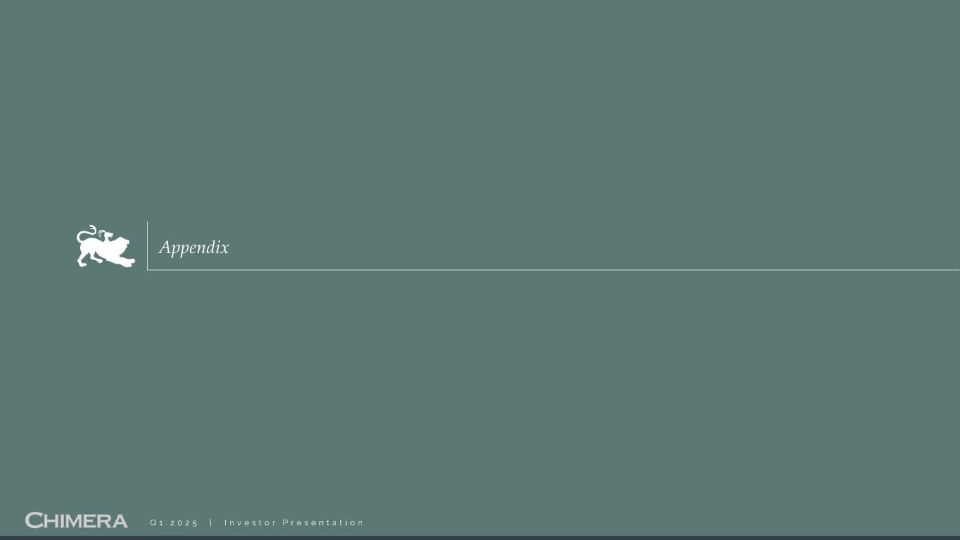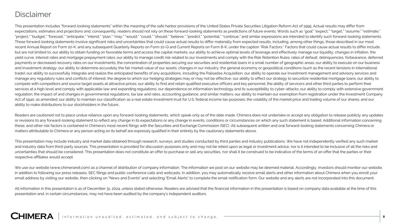 I n f o r m a t i o n u n a u d i t e d , e s t i m a t e d , a n d s u b j e c t t o c h a n g e . This presentation includes “forward-looking statements” within the meaning of the safe harbor provisions of the United States Private Securities Litigation Reform Act of 1995. Actual results may differ from expectations, estimates and projections and, consequently, readers should not rely on these forward-looking statements as predictions of future events. Words such as “goal” “expect,” “target,” “assume,” “estimate,” “project,” “budget,” “forecast,” “anticipate,” “intend,” “plan,” “may,” “would,” “could,” “should,” “believe,” “predict,” “potential,” “continue,” and similar expressions are intended to identify such forward-looking statements. These forward-looking statements involve significant risks and uncertainties that could cause actual results to differ materially from expected results, including, among other things, those described in our most recent Annual Report on Form 10-K, and any subsequent Quarterly Reports on Form 10-Q and Current Reports on Form 8-K, under the caption “Risk Factors.” Factors that could cause actual results to differ include, but are not limited to: our ability to obtain funding on favorable terms and access the capital markets; our ability to achieve optimal levels of leverage and effectively manage our liquidity; changes in inflation, the yield curve, interest rates and mortgage prepayment rates; our ability to manage credit risk related to our investments and comply with the Risk Retention Rules; rates of default, delinquencies, forbearance, deferred payments or decreased recovery rates on our investments; the concentration of properties securing our securities and residential loans in a small number of geographic areas; our ability to execute on our business and investment strategy; our ability to determine accurately the fair market value of our assets; changes in our industry, the general economy or geopolitical conditions (such as the recent tensions in international trade); our ability to successfully integrate and realize the anticipated benefits of any acquisitions, including the Palisades Acquisition; our ability to operate our investment management and advisory services and manage any regulatory rules and conflicts of interest; the degree to which our hedging strategies may or may not be effective; our ability to effect our strategy to securitize residential mortgage loans; our ability to compete with competitors and source target assets at attractive prices; our ability to find and retain qualified executive officers and key personnel; the ability of servicers and other third parties to perform their services at a high level and comply with applicable law and expanding regulations; our dependence on information technology and its susceptibility to cyber-attacks; our ability to comply with extensive government regulation; the impact of and changes in governmental regulations, tax law and rates, accounting guidance, and similar matters; our ability to maintain our exemption from registration under the Investment Company Act of 1940, as amended; our ability to maintain our classification as a real estate investment trust for U.S. federal income tax purposes; the volatility of the market price and trading volume of our shares; and our ability to make distributions to our stockholders in the future.. Readers are cautioned not to place undue reliance upon any forward-looking statements, which speak only as of the date made. Chimera does not undertake or accept any obligation to release publicly any updates or revisions to any forward-looking statement to reflect any change in its expectations or any change in events, conditions or circumstances on which any such statement is based. Additional information concerning these, and other risk factors is contained in Chimera’s most recent filings with the Securities and Exchange Commission (SEC). All subsequent written and oral forward-looking statements concerning Chimera or matters attributable to Chimera or any person acting on its behalf are expressly qualified in their entirety by the cautionary statements above. This presentation may include industry and market data obtained through research, surveys, and studies conducted by third parties and industry publications. We have not independently verified any such market and industry data from third-party sources. This presentation is provided for discussion purposes only and may not be relied upon as legal or investment advice, nor is it intended to be inclusive of all the risks and uncertainties that should be considered. This presentation does not constitute an offer to purchase or sell any securities, nor shall it be construed to be indicative of the terms of an offer that the parties or their respective affiliates would accept. We use our website (www.chimerareit.com) as a channel of distribution of company information. The information we post on our website may be deemed material. Accordingly, investors should monitor our website, in addition to following our press releases, SEC filings and public conference calls and webcasts. In addition, you may automatically receive email alerts and other information about Chimera when you enroll your email address by visiting our website, then clicking on “News and Events" and selecting "Email Alerts" to complete the email notification form. Our website and any alerts are not incorporated into this document. All information in this presentation is as of December 31, 2024, unless stated otherwise. Readers are advised that the financial information in this presentation is based on company data available at the time of this presentation and, in certain circumstances, may not have been audited by the company’s independent auditors. Disclaimer 2