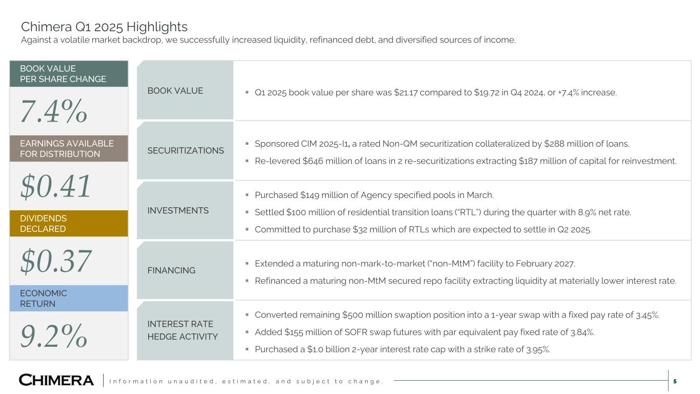 I n f o r m a t i o n u n a u d i t e d , e s t i m a t e d , a n d s u b j e c t t o c h a n g e . 4 HYBRID INVESTMENT APPROACH ▪ Invests across the spectrum of mortgage products, including, residential loans and non-agency and agency securities. ▪ Team expertise and robust infrastructure enable a disciplined approach to residential credit investing. SCALED MORTGAGE CREDIT PLATFORM ▪ Risk management approach emphasizes asset-level credit risk management. ▪ Data management capabilities and proprietary technologies drive efficiencies in process and credit decisions. THIRD-PARTY ASSET & INVESTMENT MANAGEMENT ▪ Bespoke solutions for third-party institutional investors seeking exposure to residential loans. ▪ Manager of private asset-backed credit funds on behalf of institutional allocators. KEY STATISTICS As of March 31, 2025 2007 82 $6.4B $13.2B $2.6B $24.4B(1) Year Founded Full-Time Professionals Dividends Declared Since Inception REIT Assets REIT Equity 3rd Party Managed Loans Chimera Investment Corp. Hybrid mortgage REIT delivering diversified investment solutions across the mortgage credit product spectrum.