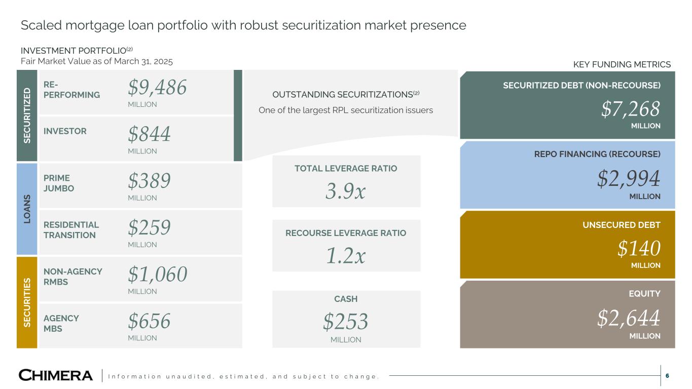 I n f o r m a t i o n u n a u d i t e d , e s t i m a t e d , a n d s u b j e c t t o c h a n g e . 5 Chimera Q1 2025 Highlights Against a volatile market backdrop, we successfully increased liquidity, refinanced debt, and diversified sources of income. BOOK VALUE PER SHARE CHANGE 7.4% EARNINGS AVAILABLE FOR DISTRIBUTION $0.41 DIVIDENDS DECLARED $0.37 ECONOMIC RETURN 9.2% BOOK VALUE ▪ Q1 2025 book value per share was $21.17 compared to $19.72 in Q4 2024, or +7.4% increase. SECURITIZATIONS ▪ Sponsored CIM 2025-I1, a rated Non-QM securitization collateralized by $288 million of loans. ▪ Re-levered $646 million of loans in 2 re-securitizations extracting $187 million of capital for reinvestment. INVESTMENTS ▪ Purchased $149 million of Agency specified pools in March. ▪ Settled $100 million of residential transition loans (“RTL”) during the quarter with 8.9% net rate. ▪ Committed to purchase $32 million of RTLs which are expected to settle in Q2 2025. FINANCING ▪ Extended a maturing non-mark-to-market (“non-MtM”) facility to February 2027. ▪ Refinanced a maturing non-MtM secured repo facility extracting liquidity at materially lower interest rate. INTEREST RATE HEDGE ACTIVITY ▪ Converted remaining $500 million swaption position into a 1-year swap with a fixed pay rate of 3.45%. ▪ Added $155 million of SOFR swap futures with par equivalent pay fixed rate of 3.84%. ▪ Purchased a $1.0 billion 2-year interest rate cap with a strike rate of 3.95%.