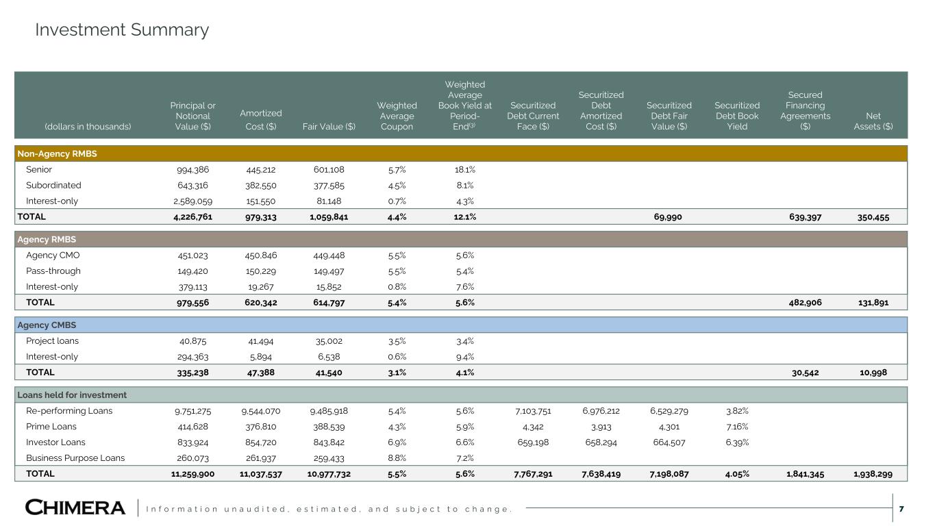 I n f o r m a t i o n u n a u d i t e d , e s t i m a t e d , a n d s u b j e c t t o c h a n g e . OUTSTANDING SECURITIZATIONS(2) One of the largest RPL securitization issuers TOTAL LEVERAGE RATIO 3.9x RECOURSE LEVERAGE RATIO 1.2x CASH $253 MILLION 6 Scaled mortgage loan portfolio with robust securitization market presence SECURITIZED DEBT (NON-RECOURSE) $7,268 MILLION REPO FINANCING (RECOURSE) $2,994 MILLION UNSECURED DEBT $140 MILLION EQUITY $2,644 MILLION INVESTMENT PORTFOLIO(2) Fair Market Value as of March 31, 2025 S E C U R IT IZ E D RE- PERFORMING $9,486 MILLION INVESTOR $844 MILLION LO A N S PRIME JUMBO $389 MILLION RESIDENTIAL TRANSITION $259 MILLION S E C U R IT IE S NON-AGENCY RMBS $1,060 MILLION AGENCY MBS $656 MILLION KEY FUNDING METRICS