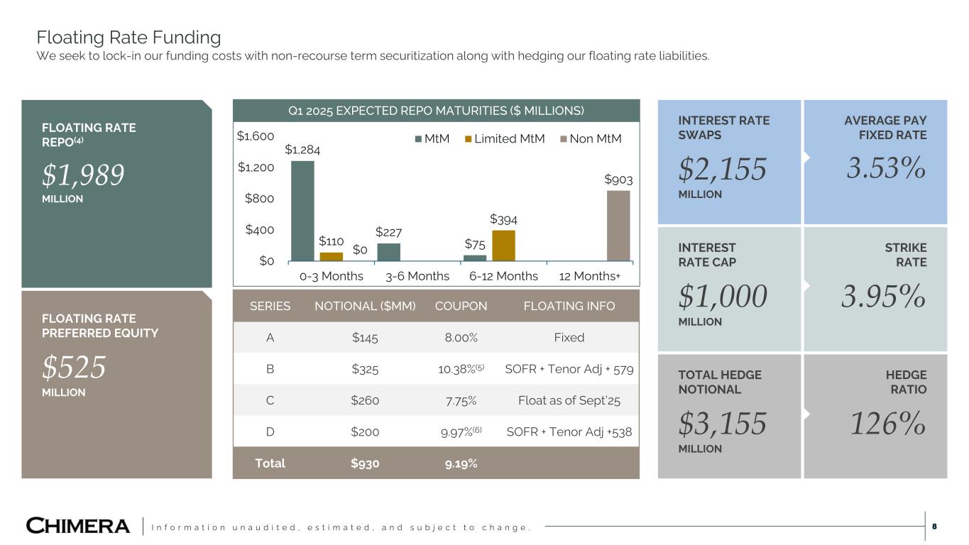 I n f o r m a t i o n u n a u d i t e d , e s t i m a t e d , a n d s u b j e c t t o c h a n g e . Investment Summary 7 (dollars in thousands) Principal or Notional Value ($) Amortized Cost ($) Fair Value ($) Weighted Average Coupon Weighted Average Book Yield at Period- End(3) Securitized Debt Current Face ($) Securitized Debt Amortized Cost ($) Securitized Debt Fair Value ($) Securitized Debt Book Yield Secured Financing Agreements ($) Net Assets ($) Non-Agency RMBS Senior 994,386 445,212 601,108 5.7% 18.1% Subordinated 643,316 382,550 377,585 4.5% 8.1% Interest-only 2,589,059 151,550 81,148 0.7% 4.3% TOTAL 4,226,761 979,313 1,059,841 4.4% 12.1% 69,990 639,397 350,455 Agency RMBS Agency CMO 451,023 450,846 449,448 5.5% 5.6% Pass-through 149,420 150,229 149,497 5.5% 5.4% Interest-only 379,113 19,267 15,852 0.8% 7.6% TOTAL 979,556 620,342 614,797 5.4% 5.6% 482,906 131,891 Agency CMBS Project loans 40,875 41,494 35,002 3.5% 3.4% Interest-only 294,363 5,894 6,538 0.6% 9.4% TOTAL 335,238 47,388 41,540 3.1% 4.1% 30,542 10,998 Loans held for investment Re-performing Loans 9,751,275 9,544,070 9,485,918 5.4% 5.6% 7,103,751 6,976,212 6,529,279 3.82% Prime Loans 414,628 376,810 388,539 4.3% 5.9% 4,342 3,913 4,301 7.16% Investor Loans 833,924 854,720 843,842 6.9% 6.6% 659,198 658,294 664,507 6.39% Business Purpose Loans 260,073 261,937 259,433 8.8% 7.2% TOTAL 11,259,900 11,037,537 10,977,732 5.5% 5.6% 7,767,291 7,638,419 7,198,087 4.05% 1,841,345 1,938,299