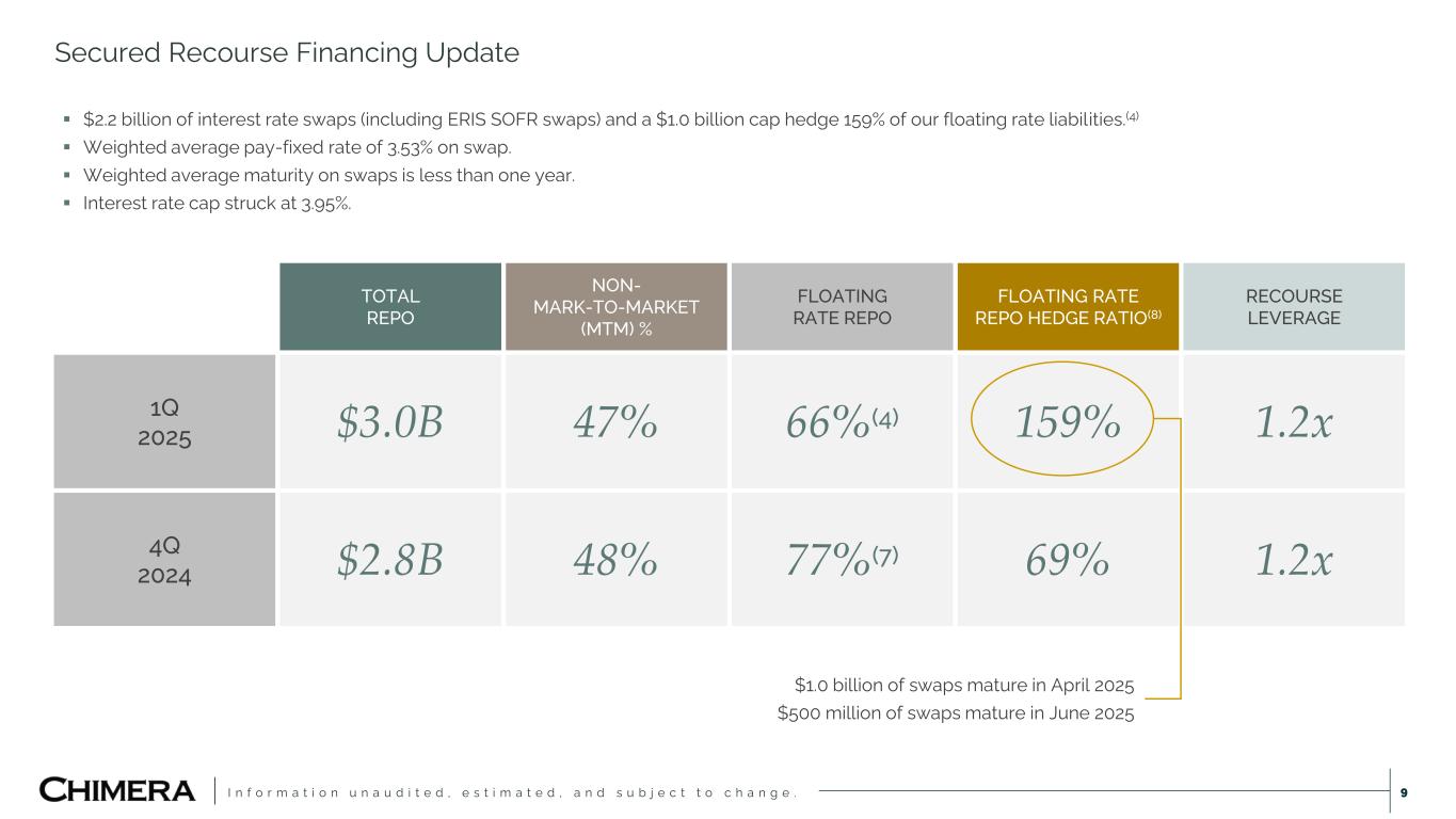 I n f o r m a t i o n u n a u d i t e d , e s t i m a t e d , a n d s u b j e c t t o c h a n g e . Q1 2025 EXPECTED REPO MATURITIES ($ MILLIONS) Floating Rate Funding We seek to lock-in our funding costs with non-recourse term securitization along with hedging our floating rate liabilities. 8 FLOATING RATE REPO(4) $1,989 MILLION FLOATING RATE PREFERRED EQUITY $525 MILLION SERIES NOTIONAL ($MM) COUPON FLOATING INFO A $145 8.00% Fixed B $325 10.38%(5) SOFR + Tenor Adj + 579 C $260 7.75% Float as of Sept’25 D $200 9.97%(6) SOFR + Tenor Adj +538 Total $930 9.19% Q1 2025 EXPECTED REPO MATURITIES ($ MILLIONS) $1,284 $227 $75 $110 $394 $0 $903 $0 $400 $800 $1,200 $1,600 0-3 Months 3-6 Months 6-12 Months 12 Months+ MtM Limited MtM Non MtM INTEREST RATE SWAPS $2,155 MILLION AVERAGE PAY FIXED RATE 3.53% INTEREST RATE CAP $1,000 MILLION STRIKE RATE 3.95% TOTAL HEDGE NOTIONAL $3,155 MILLION HEDGE RATIO 126%