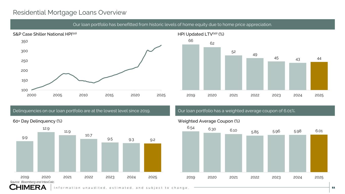 I n f o r m a t i o n u n a u d i t e d , e s t i m a t e d , a n d s u b j e c t t o c h a n g e . ▪ We acquire residential mortgage loans from banks, non-bank financial institutions and government sponsored agencies. ▪ We finance purchases of mortgage loans via warehouse facilities and repurchase agreements (recourse financing). ▪ We securitize mortgage loans by selling senior securities (long-term non-recourse financing) and retaining subordinate and interest-only securities. ▪ We finance retained securities via repurchase agreements (secured recourse financing) to enhance our return on investment. Q1’25 Key Loan Statistics Total Current Unpaid Principal Balance (UPB) $11.3 Billion(9) Total Number of Loans 102,392 Weighted Average Loan Size $110K Weighted Average Coupon 6.01% Weighted Average FICO 670 Weighted Average Loan Age (WALA) 187 Months Weighted Average Original Loan-to-Value (LTV) 79% Amortized Loan-to-Value (LTV) 63% HPI Updated Loan-to-Value (LTV)(10) 44% 60+ Days Delinquent 9.2% Residential Mortgage Overview 10 Weighted Average Loan Age (Months) 162 173 184 180 184 190 187 2019 2020 2021 2022 2023 2024 2025 ▪ 76% of our loans were originated 2008 and prior Source: Bloomberg and IntexCalc.