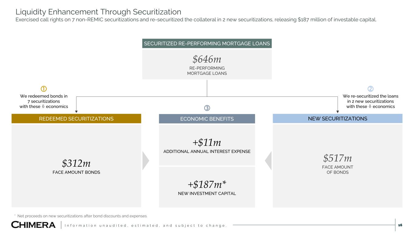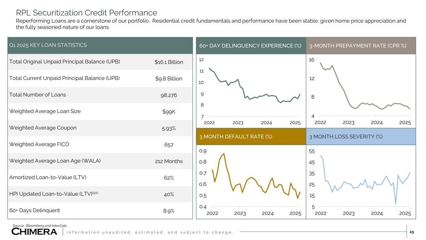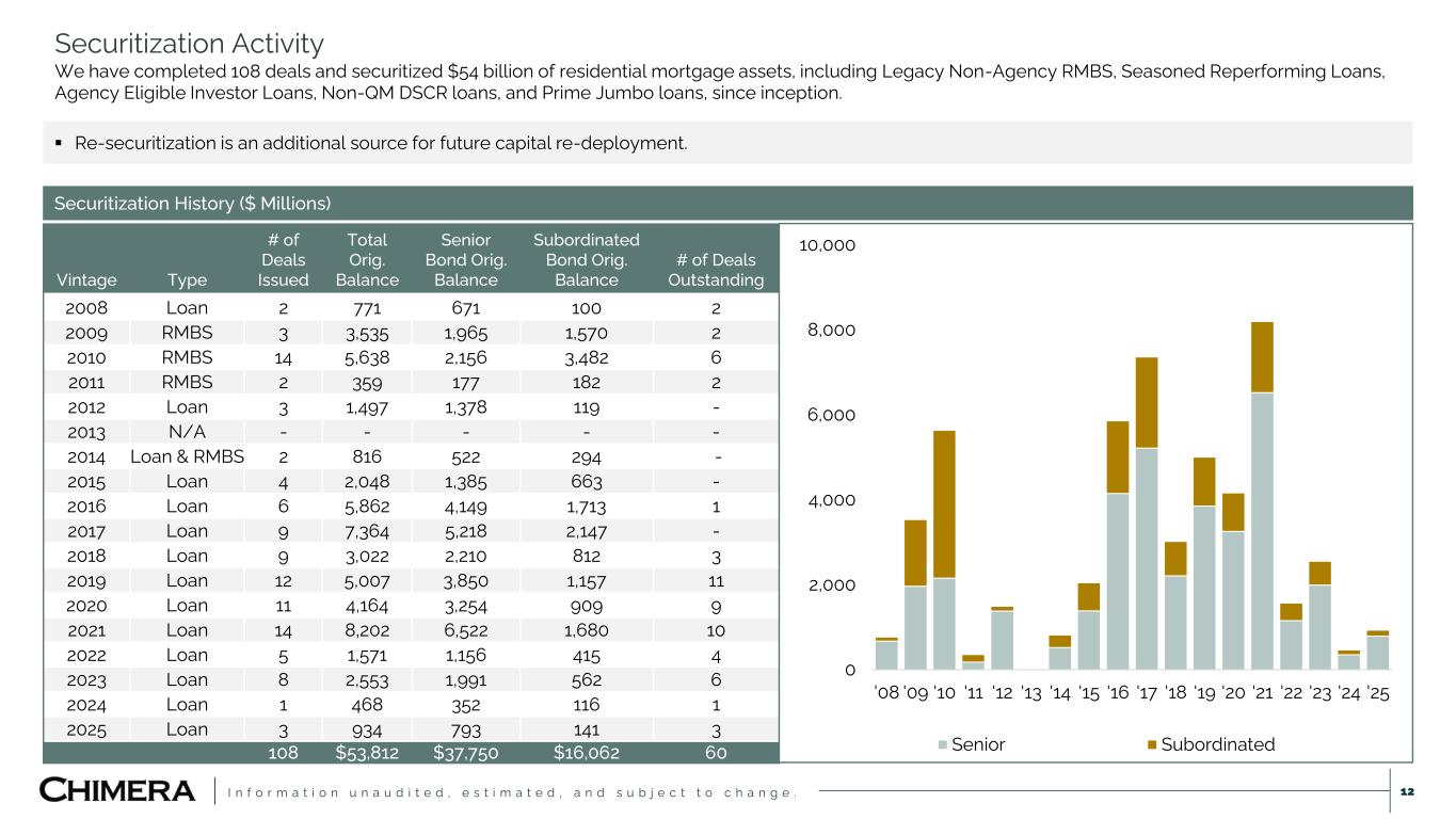 I n f o r m a t i o n u n a u d i t e d , e s t i m a t e d , a n d s u b j e c t t o c h a n g e . ▪ Re-securitization is an additional source for future capital re-deployment. Securitization History ($ Millions) 0 2,000 4,000 6,000 8,000 10,000 '08 '09 '10 '11 '12 '13 '14 '15 '16 '17 '18 '19 '20 '21 '22 '23 '24 '25 Senior Subordinated Securitization Activity We have completed 108 deals and securitized $54 billion of residential mortgage assets, including Legacy Non-Agency RMBS, Seasoned Reperforming Loans, Agency Eligible Investor Loans, Non-QM DSCR loans, and Prime Jumbo loans, since inception. Vintage Type # of Deals Issued Total Orig. Balance Senior Bond Orig. Balance Subordinated Bond Orig. Balance # of Deals Outstanding 2008 Loan 2 771 671 100 2 2009 RMBS 3 3,535 1,965 1,570 2 2010 RMBS 14 5,638 2,156 3,482 6 2011 RMBS 2 359 177 182 2 2012 Loan 3 1,497 1,378 119 - 2013 N/A - - - - - 2014 Loan & RMBS 2 816 522 294 - 2015 Loan 4 2,048 1,385 663 - 2016 Loan 6 5,862 4,149 1,713 1 2017 Loan 9 7,364 5,218 2,147 - 2018 Loan 9 3,022 2,210 812 3 2019 Loan 12 5,007 3,850 1,157 11 2020 Loan 11 4,164 3,254 909 9 2021 Loan 14 8,202 6,522 1,680 10 2022 Loan 5 1,571 1,156 415 4 2023 Loan 8 2,553 1,991 562 6 2024 Loan 1 468 352 116 1 2025 Loan 3 934 793 141 3 108 $53,812 $37,750 $16,062 60 12
