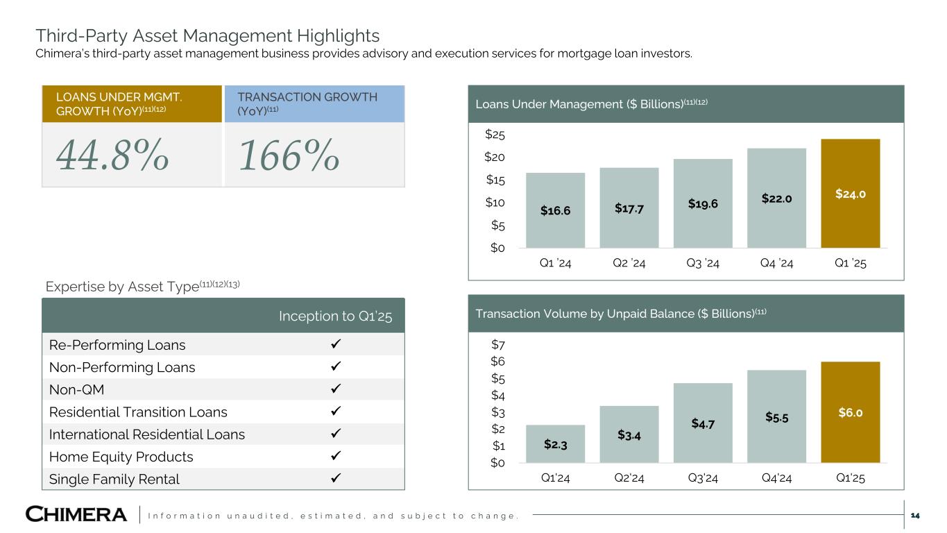 I n f o r m a t i o n u n a u d i t e d , e s t i m a t e d , a n d s u b j e c t t o c h a n g e . Third-Party Asset Management Highlights Chimera’s third-party asset management business provides advisory and execution services for mortgage loan investors. 14 LOANS UNDER MGMT. GROWTH (YoY)(11)(12) TRANSACTION GROWTH (YoY)(11) 44.8% 166% Loans Under Management ($ Billions)(11)(12) $16.6 $17.7 $19.6 $22.0 $24.0 $0 $5 $10 $15 $20 $25 Q1 ’24 Q2 ’24 Q3 ’24 Q4 ’24 Q1 ’25 $2.3 $3.4 $4.7 $5.5 $6.0 $0 $1 $2 $3 $4 $5 $6 $7 Q1'24 Q2'24 Q3'24 Q4'24 Q1'25 Transaction Volume by Unpaid Balance ($ Billions)(11) Expertise by Asset Type(11)(12)(13) Inception to Q1’25 Re-Performing Loans ✓ Non-Performing Loans ✓ Non-QM ✓ Residential Transition Loans ✓ International Residential Loans ✓ Home Equity Products ✓ Single Family Rental ✓