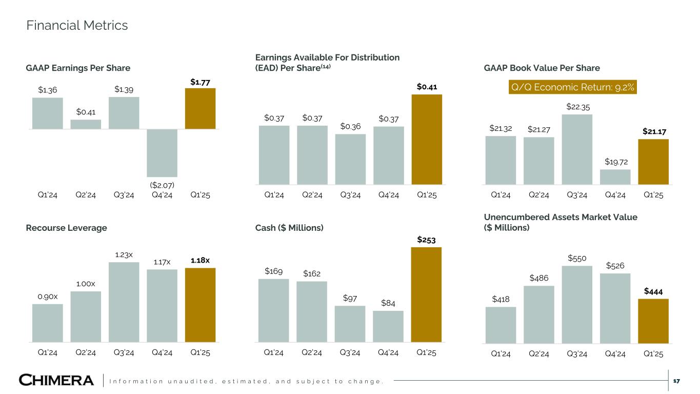 I n f o r m a t i o n u n a u d i t e d , e s t i m a t e d , a n d s u b j e c t t o c h a n g e . $21.32 $21.27 $22.35 $19.72 $21.17 Q1'24 Q2'24 Q3'24 Q4'24 Q1'25 Q/Q Economic Return: 9.2%$1.36 $0.41 $1.39 ($2.07) $1.77 Q1'24 Q2'24 Q3'24 Q4'24 Q1'25 $0.37 $0.37 $0.36 $0.37 $0.41 Q1'24 Q2'24 Q3'24 Q4'24 Q1'25 0.90x 1.00x 1.23x 1.17x 1.18x Q1'24 Q2'24 Q3'24 Q4'24 Q1'25 $169 $162 $97 $84 $253 Q1'24 Q2'24 Q3'24 Q4'24 Q1'25 $418 $486 $550 $526 $444 Q1'24 Q2'24 Q3'24 Q4'24 Q1'25 GAAP Earnings Per Share Earnings Available For Distribution (EAD) Per Share(14) GAAP Book Value Per Share Recourse Leverage Cash ($ Millions) Unencumbered Assets Market Value ($ Millions) Financial Metrics 17
