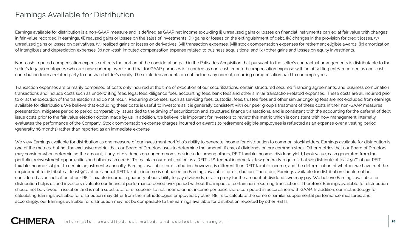 I n f o r m a t i o n u n a u d i t e d , e s t i m a t e d , a n d s u b j e c t t o c h a n g e . Earnings available for distribution is a non-GAAP measure and is defined as GAAP net income excluding (i) unrealized gains or losses on financial instruments carried at fair value with changes in fair value recorded in earnings, (ii) realized gains or losses on the sales of investments, (iii) gains or losses on the extinguishment of debt, (iv) changes in the provision for credit losses, (v) unrealized gains or losses on derivatives, (vi) realized gains or losses on derivatives, (vii) transaction expenses, (viii) stock compensation expenses for retirement eligible awards, (ix) amortization of intangibles and depreciation expenses, (x) non-cash imputed compensation expense related to business acquisitions, and (xi) other gains and losses on equity investments. Non-cash imputed compensation expense reflects the portion of the consideration paid in the Palisades Acquisition that pursuant to the seller’s contractual arrangements is distributable to the seller’s legacy employees (who are now our employees) and that for GAAP purposes is recorded as non-cash imputed compensation expense with an offsetting entry recorded as non-cash contribution from a related party to our shareholder’s equity. The excluded amounts do not include any normal, recurring compensation paid to our employees. Transaction expenses are primarily comprised of costs only incurred at the time of execution of our securitizations, certain structured secured financing agreements, and business combination transactions and include costs such as underwriting fees, legal fees, diligence fees, accounting fees, bank fees and other similar transaction-related expenses. These costs are all incurred prior to or at the execution of the transaction and do not recur. Recurring expenses, such as servicing fees, custodial fees, trustee fees and other similar ongoing fees are not excluded from earnings available for distribution. We believe that excluding these costs is useful to investors as it is generally consistent with our peer group’s treatment of these costs in their non-GAAP measures presentation, mitigates period to period comparability issues tied to the timing of securitization and structured finance transactions, and is consistent with the accounting for the deferral of debt issue costs prior to the fair value election option made by us. In addition, we believe it is important for investors to review this metric which is consistent with how management internally evaluates the performance of the Company. Stock compensation expense charges incurred on awards to retirement eligible employees is reflected as an expense over a vesting period (generally 36 months) rather than reported as an immediate expense. We view Earnings available for distribution as one measure of our investment portfolio's ability to generate income for distribution to common stockholders. Earnings available for distribution is one of the metrics, but not the exclusive metric, that our Board of Directors uses to determine the amount, if any, of dividends on our common stock. Other metrics that our Board of Directors may consider when determining the amount, if any, of dividends on our common stock include, among others, REIT taxable income, dividend yield, book value, cash generated from the portfolio, reinvestment opportunities and other cash needs. To maintain our qualification as a REIT, U.S. federal income tax law generally requires that we distribute at least 90% of our REIT taxable income (subject to certain adjustments) annually. Earnings available for distribution, however, is different than REIT taxable income, and the determination of whether we have met the requirement to distribute at least 90% of our annual REIT taxable income is not based on Earnings available for distribution. Therefore, Earnings available for distribution should not be considered as an indication of our REIT taxable income, a guaranty of our ability to pay dividends, or as a proxy for the amount of dividends we may pay. We believe Earnings available for distribution helps us and investors evaluate our financial performance period over period without the impact of certain non-recurring transactions. Therefore, Earnings available for distribution should not be viewed in isolation and is not a substitute for or superior to net income or net income per basic share computed in accordance with GAAP. In addition, our methodology for calculating Earnings available for distribution may differ from the methodologies employed by other REITs to calculate the same or similar supplemental performance measures, and accordingly, our Earnings available for distribution may not be comparable to the Earnings available for distribution reported by other REITs. Earnings Available for Distribution 18