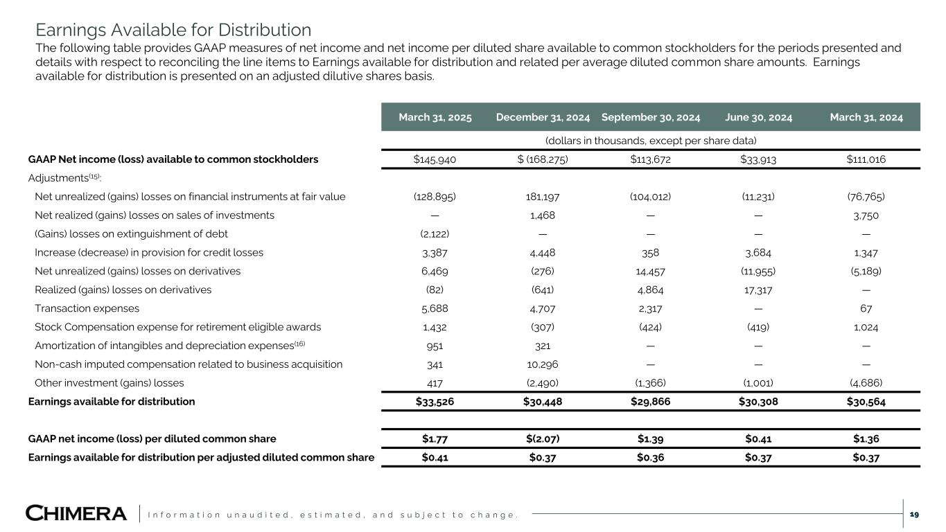 I n f o r m a t i o n u n a u d i t e d , e s t i m a t e d , a n d s u b j e c t t o c h a n g e . Earnings Available for Distribution The following table provides GAAP measures of net income and net income per diluted share available to common stockholders for the periods presented and details with respect to reconciling the line items to Earnings available for distribution and related per average diluted common share amounts. Earnings available for distribution is presented on an adjusted dilutive shares basis. 19 March 31, 2025 December 31, 2024 September 30, 2024 June 30, 2024 March 31, 2024 (dollars in thousands, except per share data) GAAP Net income (loss) available to common stockholders $145,940 $ (168,275) $113,672 $33,913 $111,016 Adjustments(15): Net unrealized (gains) losses on financial instruments at fair value (128,895) 181,197 (104,012) (11,231) (76,765) Net realized (gains) losses on sales of investments — 1,468 — — 3,750 (Gains) losses on extinguishment of debt (2,122) — — — — Increase (decrease) in provision for credit losses 3,387 4,448 358 3,684 1,347 Net unrealized (gains) losses on derivatives 6,469 (276) 14,457 (11,955) (5,189) Realized (gains) losses on derivatives (82) (641) 4,864 17,317 — Transaction expenses 5,688 4,707 2,317 — 67 Stock Compensation expense for retirement eligible awards 1,432 (307) (424) (419) 1,024 Amortization of intangibles and depreciation expenses(16) 951 321 — — — Non-cash imputed compensation related to business acquisition 341 10,296 — — — Other investment (gains) losses 417 (2,490) (1,366) (1,001) (4,686) Earnings available for distribution $33,526 $30,448 $29,866 $30,308 $30,564 GAAP net income (loss) per diluted common share $1.77 $(2.07) $1.39 $0.41 $1.36 Earnings available for distribution per adjusted diluted common share $0.41 $0.37 $0.36 $0.37 $0.37