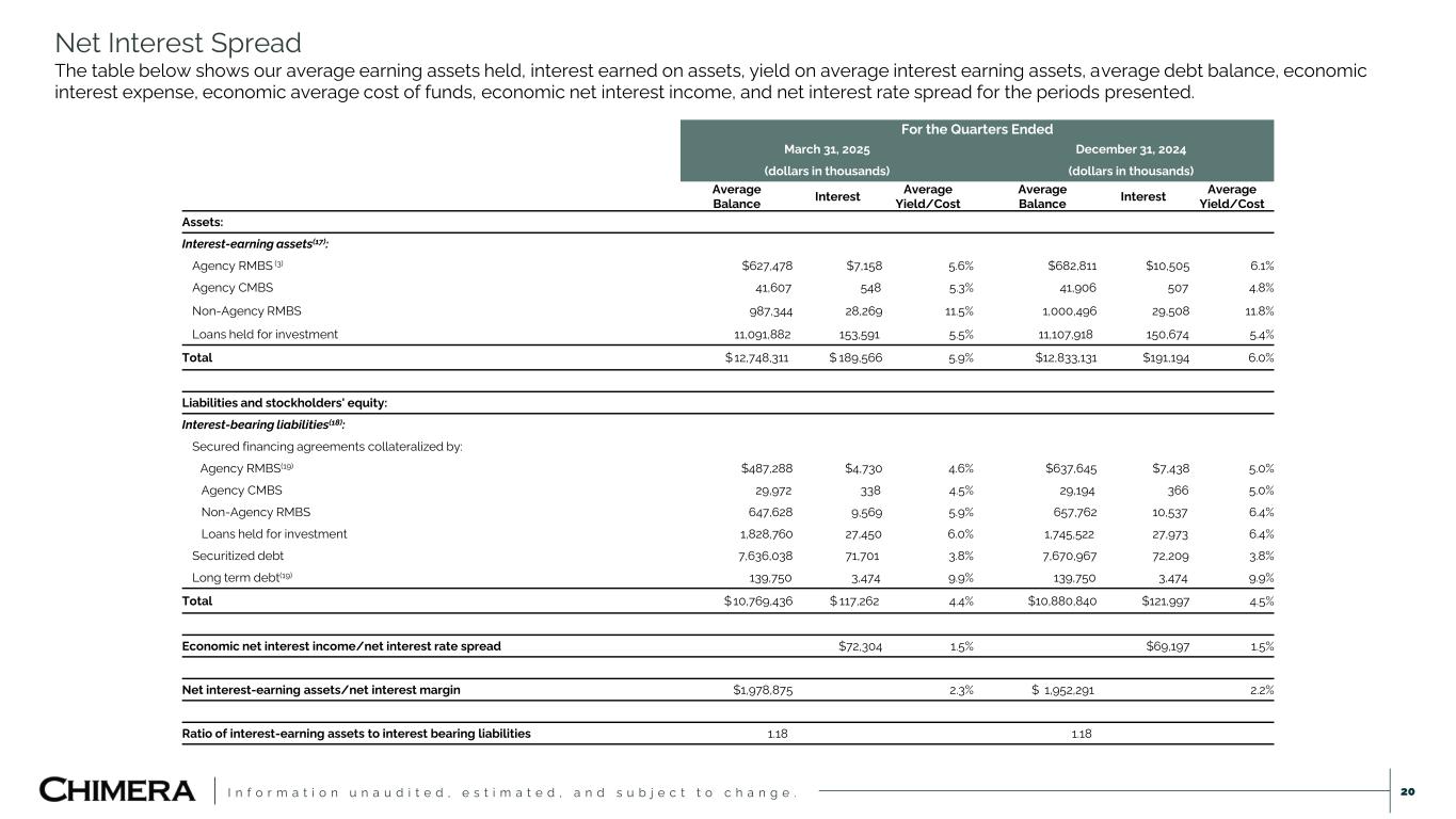 I n f o r m a t i o n u n a u d i t e d , e s t i m a t e d , a n d s u b j e c t t o c h a n g e . Net Interest Spread The table below shows our average earning assets held, interest earned on assets, yield on average interest earning assets, average debt balance, economic interest expense, economic average cost of funds, economic net interest income, and net interest rate spread for the periods presented. 20 For the Quarters Ended March 31, 2025 December 31, 2024 (dollars in thousands) (dollars in thousands) Average Balance Interest Average Yield/Cost Average Balance Interest Average Yield/Cost Assets: Interest-earning assets(17): Agency RMBS (3) $627,478 $7,158 5.6% $682,811 $10,505 6.1% Agency CMBS 41,607 548 5.3% 41,906 507 4.8% Non-Agency RMBS 987,344 28,269 11.5% 1,000,496 29,508 11.8% Loans held for investment 11,091,882 153,591 5.5% 11,107,918 150,674 5.4% Total $ 12,748,311 $ 189,566 5.9% $12,833,131 $191,194 6.0% Liabilities and stockholders' equity: Interest-bearing liabilities(18): Secured financing agreements collateralized by: Agency RMBS(19) $487,288 $4,730 4.6% $637,645 $7,438 5.0% Agency CMBS 29,972 338 4.5% 29,194 366 5.0% Non-Agency RMBS 647,628 9,569 5.9% 657,762 10,537 6.4% Loans held for investment 1,828,760 27,450 6.0% 1,745,522 27,973 6.4% Securitized debt 7,636,038 71,701 3.8% 7,670,967 72,209 3.8% Long term debt(19) 139,750 3,474 9.9% 139,750 3,474 9.9% Total $ 10,769,436 $ 117,262 4.4% $10,880,840 $121,997 4.5% Economic net interest income/net interest rate spread $72,304 1.5% $69,197 1.5% Net interest-earning assets/net interest margin $1,978,875 2.3% $ 1,952,291 2.2% Ratio of interest-earning assets to interest bearing liabilities 1.18 1.18