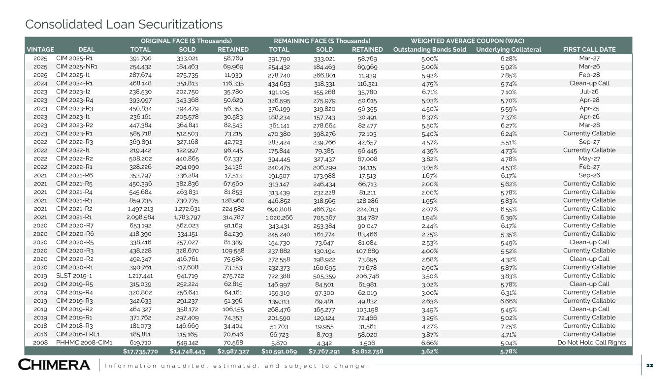 I n f o r m a t i o n u n a u d i t e d , e s t i m a t e d , a n d s u b j e c t t o c h a n g e . Investment Summary (12/31/24) 21 (dollars in thousands) Principal or Notional Value ($) Amortized Cost ($) Fair Value ($) Weighted Average Coupon Weighted Average Book Yield at Period- End(3) Securitized Debt Current Face ($) Securitized Debt Amortized Cost ($) Securitized Debt Fair Value ($) Securitized Debt Book Yield Secured Financing Agreements ($) Net Assets ($) Non-Agency RMBS Senior 1,010,128 455,660 614,493 5.7% 17.6% Subordinated 648,977 384,075 376,341 4.5% 8.0% Interest-only 2,644,741 153,572 73,335 0.7% 6.6% TOTAL 4,303,845 993,307 1,064,170 4.4% 12.2% 71,247 653,486 339,436 Agency RMBS Agency CMO 464,640 464,524 461,658 5.8% 5.8% Interest-only 380,311 19,594 16,784 0.6% 6.9% TOTAL 844,951 484,118 478,441 5.6% 5.9% 402,664 75,979 Agency CMBS Project loans 40,882 41,501 34,370 3.5% 3.4% Interest-only 449,437 6,134 6,408 0.5% 8.9% TOTAL 490,320 47,635 40,778 3.1% 4.1% Loans held for investment Re-performing Loans 10,013,840 9,802,123 9,605,041 5.5% 5.5% 7,155,087 7,039,101 6,565,127 3.66% Prime Loans 420,446 381,556 388,918 4.3% 5.9% 4,751 4,238 4,674 7.09% Investor Loans 573,748 585,432 565,925 6.5% 6.4% 410,883 409,733 414,692 6.55% Business Purpose Loans 213,313 214,852 212,978 8.9% 8.9% TOTAL 11,221,347 10,983,964 10,772,862 5.5% 5.6% 7,570,0721 7,453,072 6,984,493 3.82% 1,739,117 2,049,251