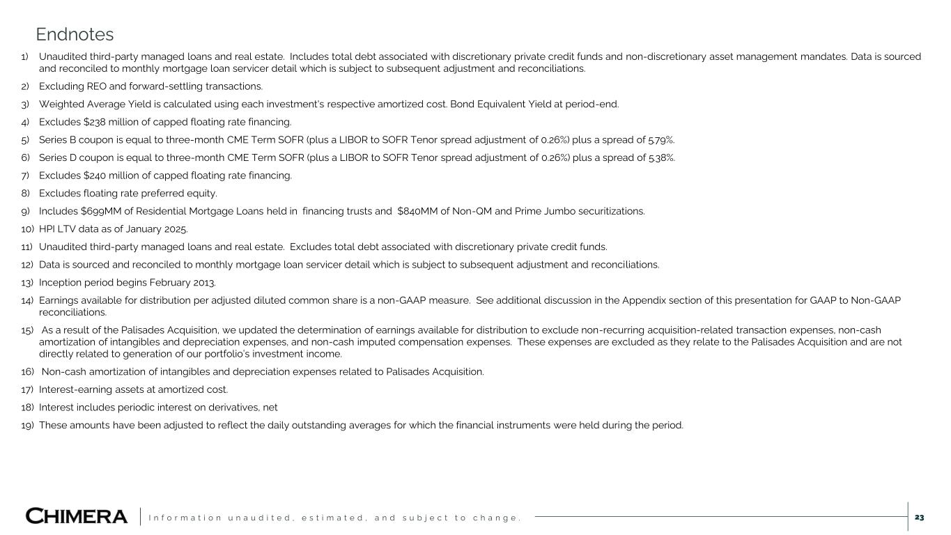 I n f o r m a t i o n u n a u d i t e d , e s t i m a t e d , a n d s u b j e c t t o c h a n g e . 1) Unaudited third-party managed loans and real estate. Includes total debt associated with discretionary private credit funds and non-discretionary asset management mandates. Data is sourced and reconciled to monthly mortgage loan servicer detail which is subject to subsequent adjustment and reconciliations. 2) Excluding REO and forward-settling transactions. 3) Weighted Average Yield is calculated using each investment's respective amortized cost. Bond Equivalent Yield at period-end. 4) Excludes $238 million of capped floating rate financing. 5) Series B coupon is equal to three-month CME Term SOFR (plus a LIBOR to SOFR Tenor spread adjustment of 0.26%) plus a spread of 5.79%. 6) Series D coupon is equal to three-month CME Term SOFR (plus a LIBOR to SOFR Tenor spread adjustment of 0.26%) plus a spread of 5.38%. 7) Excludes $240 million of capped floating rate financing. 8) Excludes floating rate preferred equity. 9) Includes $699MM of Residential Mortgage Loans held in financing trusts and $840MM of Non-QM and Prime Jumbo securitizations. 10) HPI LTV data as of January 2025. 11) Unaudited third-party managed loans and real estate. Excludes total debt associated with discretionary private credit funds. 12) Data is sourced and reconciled to monthly mortgage loan servicer detail which is subject to subsequent adjustment and reconciliations. 13) Inception period begins February 2013. 14) Earnings available for distribution per adjusted diluted common share is a non-GAAP measure. See additional discussion in the Appendix section of this presentation for GAAP to Non-GAAP reconciliations. 15) As a result of the Palisades Acquisition, we updated the determination of earnings available for distribution to exclude non-recurring acquisition-related transaction expenses, non-cash amortization of intangibles and depreciation expenses, and non-cash imputed compensation expenses. These expenses are excluded as they relate to the Palisades Acquisition and are not directly related to generation of our portfolio’s investment income. 16) Non-cash amortization of intangibles and depreciation expenses related to Palisades Acquisition. 17) Interest-earning assets at amortized cost. 18) Interest includes periodic interest on derivatives, net 19) These amounts have been adjusted to reflect the daily outstanding averages for which the financial instruments were held during the period. Endnotes 23