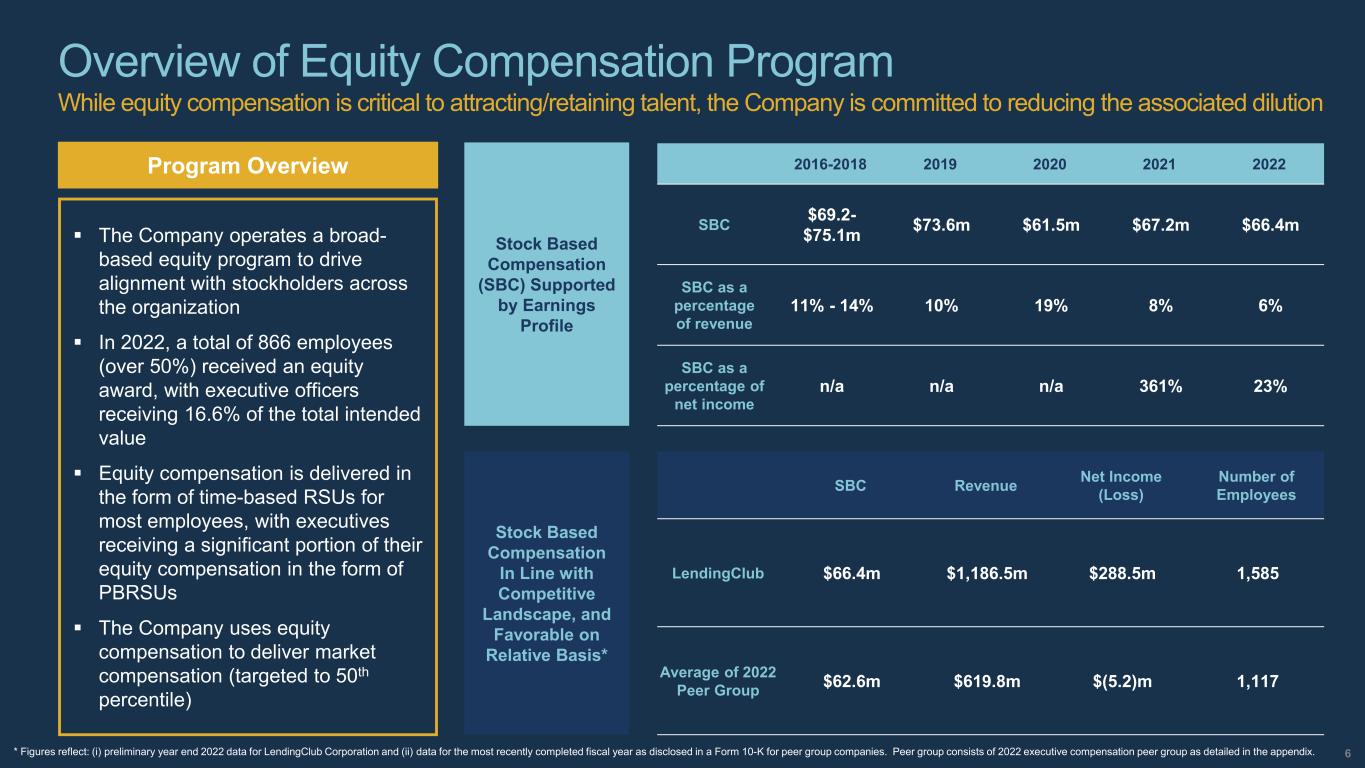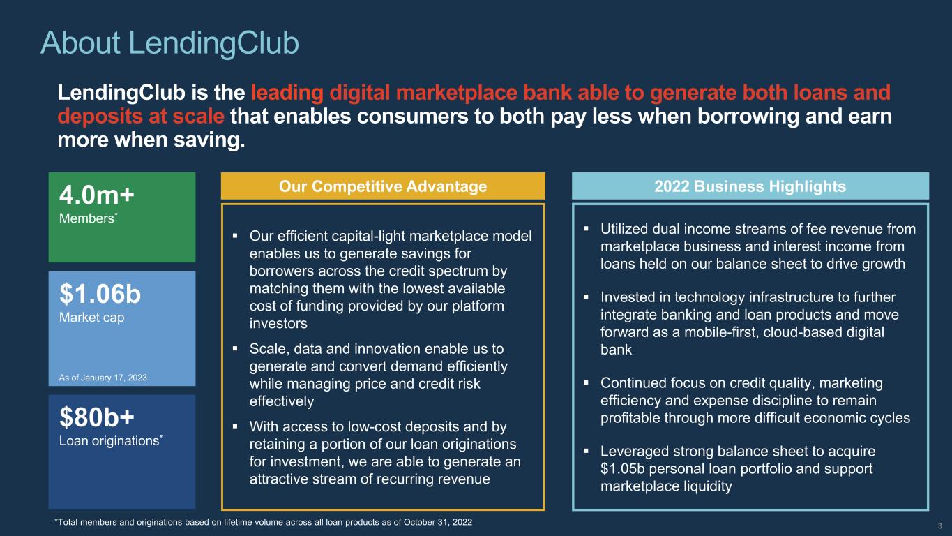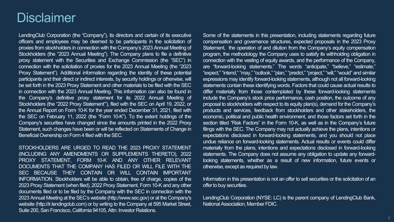 2 Disclaimer LendingClub Corporation (the “Company”), its directors and certain of its executive officers and employees may be deemed to be participants in the solicitation of proxies from stockholders in connection with the Company’s 2023 Annual Meeting of Stockholders (the “2023 Annual Meeting”). The Company plans to file a definitive proxy statement with the Securities and Exchange Commission (the “SEC”) in connection with the solicitation of proxies for the 2023 Annual Meeting (the “2023 Proxy Statement”). Additional information regarding the identity of these potential participants and their direct or indirect interests, by security holdings or otherwise, will be set forth in the 2023 Proxy Statement and other materials to be filed with the SEC in connection with the 2023 Annual Meeting. This information can also be found in the Company's definitive proxy statement for its 2022 Annual Meeting of Stockholders (the “2022 Proxy Statement’”), filed with the SEC on April 19, 2022, or the Annual Report on Form 10-K for the year ended December 31, 2021, filed with the SEC on February 11, 2022 (the “Form 10-K”). To the extent holdings of the Company's securities have changed since the amounts printed in the 2022 Proxy Statement, such changes have been or will be reflected on Statements of Change in Beneficial Ownership on Form 4 filed with the SEC. STOCKHOLDERS ARE URGED TO READ THE 2023 PROXY STATEMENT (INCLUDING ANY AMENDMENTS OR SUPPLEMENTS THERETO), 2022 PROXY STATEMENT, FORM 10-K AND ANY OTHER RELEVANT DOCUMENTS THAT THE COMPANY HAS FILED OR WILL FILE WITH THE SEC BECAUSE THEY CONTAIN OR WILL CONTAIN IMPORTANT INFORMATION. Stockholders will be able to obtain, free of charge, copies of the 2023 Proxy Statement (when filed), 2022 Proxy Statement, Form 10-K and any other documents filed or to be filed by the Company with the SEC in connection with the 2023 Annual Meeting at the SEC’s website (http://www.sec.gov) or at the Company's website (http://ir.lendingclub.com) or by writing to the Company at 595 Market Street, Suite 200, San Francisco, California 94105, Attn: Investor Relations. Some of the statements in this presentation, including statements regarding future compensation and governance structures, expected proposals in the 2023 Proxy Statement, the operation of and dilution from the Company’s equity compensation program, the methodology the Company uses to satisfy its withholding obligation in connection with the vesting of equity awards, and the performance of the Company, are “forward-looking statements.” The words “anticipate,” “believe,” “estimate,” “expect,” “intend,” “may,” “outlook,” “plan,” “predict,” “project,” “will,” “would” and similar expressions may identify forward-looking statements, although not all forward-looking statements contain these identifying words. Factors that could cause actual results to differ materially from those contemplated by these forward-looking statements include the Company’s stock price performance, cash position, the outcome of any proposal to stockholders with respect to its equity plan(s), demand for the Company’s products and services, feedback from stockholders and other stakeholders, the economic, political and public health environment, and those factors set forth in the section titled “Risk Factors” in the Form 10-K, as well as in the Company’s future filings with the SEC. The Company may not actually achieve the plans, intentions or expectations disclosed in forward-looking statements, and you should not place undue reliance on forward-looking statements. Actual results or events could differ materially from the plans, intentions and expectations disclosed in forward-looking statements. The Company does not assume any obligation to update any forward- looking statements, whether as a result of new information, future events or otherwise, except as required by law. Information in this presentation is not an offer to sell securities or the solicitation of an offer to buy securities. LendingClub Corporation (NYSE: LC) is the parent company of LendingClub Bank, National Association, Member FDIC.