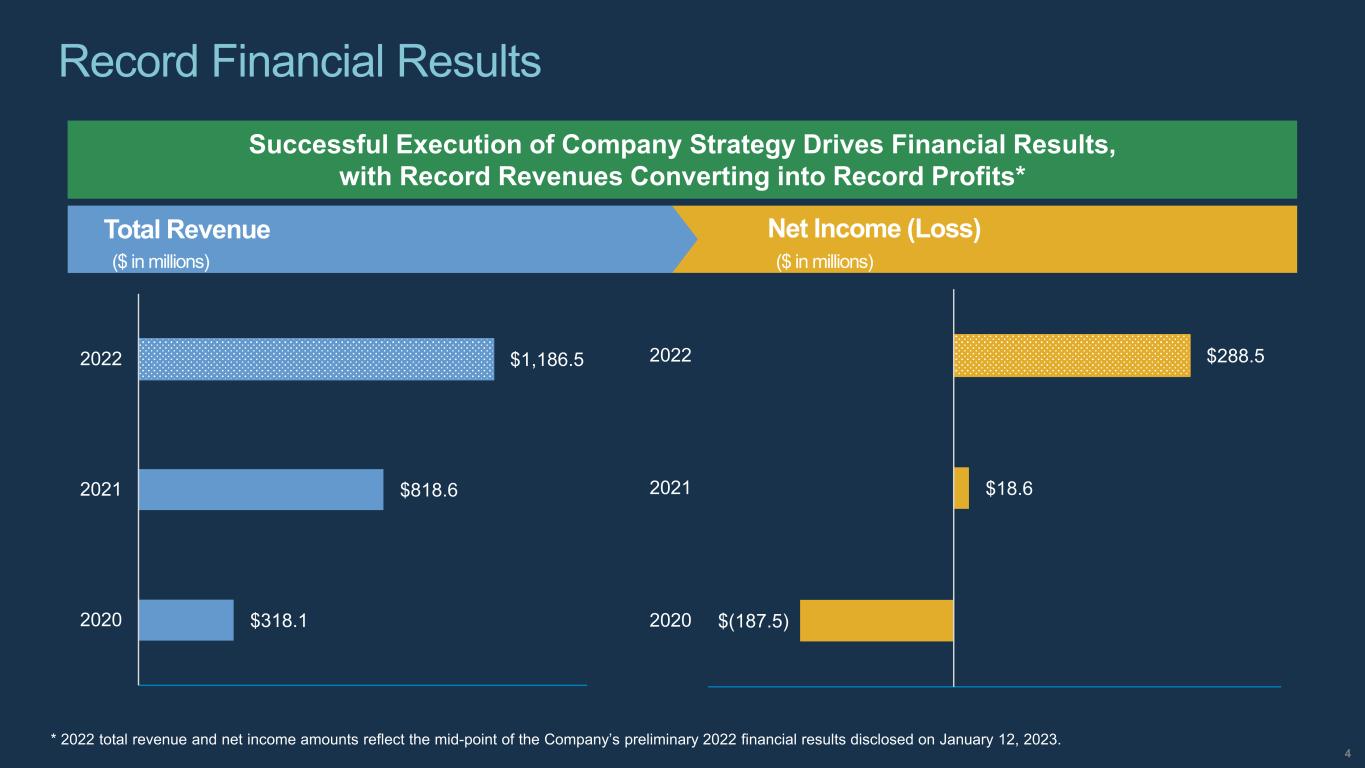 4 Record Financial Results Total Revenue ($ in millions) Net Income (Loss) ($ in millions) $318.1 $818.6 $1,186.5 2020 2021 2022 $(187.5) $18.6 $288.5 2020 2021 2022 Successful Execution of Company Strategy Drives Financial Results, with Record Revenues Converting into Record Profits* * 2022 total revenue and net income amounts reflect the mid-point of the Company’s preliminary 2022 financial results disclosed on January 12, 2023.