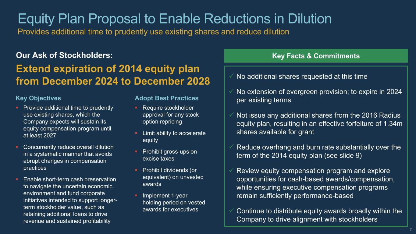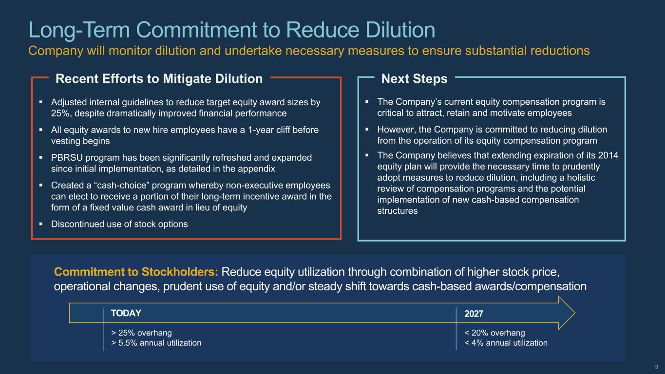 7 Equity Plan Proposal to Enable Reductions in Dilution Provides additional time to prudently use existing shares and reduce dilution Our Ask of Stockholders: Extend expiration of 2014 equity plan from December 2024 to December 2028  No additional shares requested at this time  No extension of evergreen provision; to expire in 2024 per existing terms  Not issue any additional shares from the 2016 Radius equity plan, resulting in an effective forfeiture of 1.34m shares available for grant  Reduce overhang and burn rate substantially over the term of the 2014 equity plan (see slide 9)  Review equity compensation program and explore opportunities for cash-based awards/compensation, while ensuring executive compensation programs remain sufficiently performance-based  Continue to distribute equity awards broadly within the Company to drive alignment with stockholders Key Objectives  Provide additional time to prudently use existing shares, which the Company expects will sustain its equity compensation program until at least 2027  Concurrently reduce overall dilution in a systematic manner that avoids abrupt changes in compensation practices  Enable short-term cash preservation to navigate the uncertain economic environment and fund corporate initiatives intended to support longer- term stockholder value, such as retaining additional loans to drive revenue and sustained profitability Adopt Best Practices  Require stockholder approval for any stock option repricing  Limit ability to accelerate equity  Prohibit gross-ups on excise taxes  Prohibit dividends (or equivalent) on unvested awards  Implement 1-year holding period on vested awards for executives Key Facts & Commitments