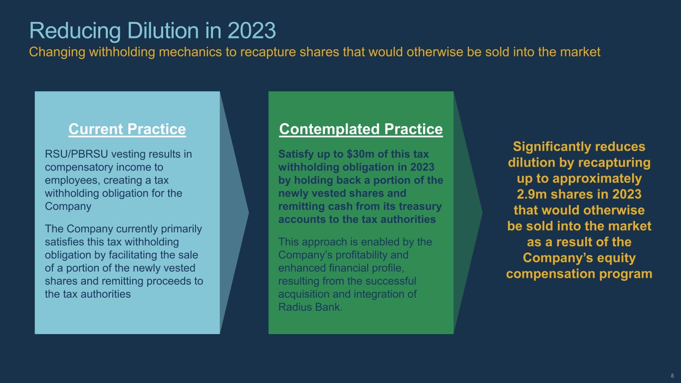8 Reducing Dilution in 2023 Changing withholding mechanics to recapture shares that would otherwise be sold into the market Current Practice RSU/PBRSU vesting results in compensatory income to employees, creating a tax withholding obligation for the Company The Company currently primarily satisfies this tax withholding obligation by facilitating the sale of a portion of the newly vested shares and remitting proceeds to the tax authorities Significantly reduces dilution by recapturing up to approximately 2.9m shares in 2023 that would otherwise be sold into the market as a result of the Company’s equity compensation program Contemplated Practice Satisfy up to $30m of this tax withholding obligation in 2023 by holding back a portion of the newly vested shares and remitting cash from its treasury accounts to the tax authorities This approach is enabled by the Company’s profitability and enhanced financial profile, resulting from the successful acquisition and integration of Radius Bank.