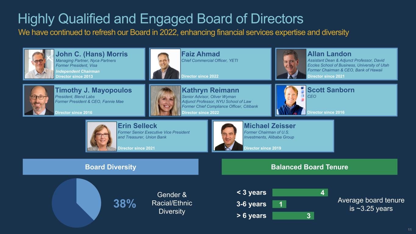 11 Highly Qualified and Engaged Board of Directors John C. (Hans) Morris Managing Partner, Nyca Partners Former President, Visa Independent Chairman Director since 2013 Timothy J. Mayopoulos President, Blend Labs Former President & CEO, Fannie Mae Director since 2016 Allan Landon Assistant Dean & Adjunct Professor, David Eccles School of Business, University of Utah Former Chairman & CEO, Bank of Hawaii Director since 2021 Scott Sanborn CEO Director since 2016 Erin Selleck Former Senior Executive Vice President and Treasurer, Union Bank Director since 2021 Michael Zeisser Former Chairman of U.S. Investments, Alibaba Group Director since 2019 Balanced Board TenureBoard Diversity Average board tenure is ~3.25 years38% 3 1 4 > 6 years 3-6 years < 3 years Kathryn Reimann Senior Advisor, Oliver Wyman Adjunct Professor, NYU School of Law Former Chief Compliance Officer, Citibank Director since 2022 Faiz Ahmad Chief Commercial Officer, YETI Director since 2022 We have continued to refresh our Board in 2022, enhancing financial services expertise and diversity Gender & Racial/Ethnic Diversity