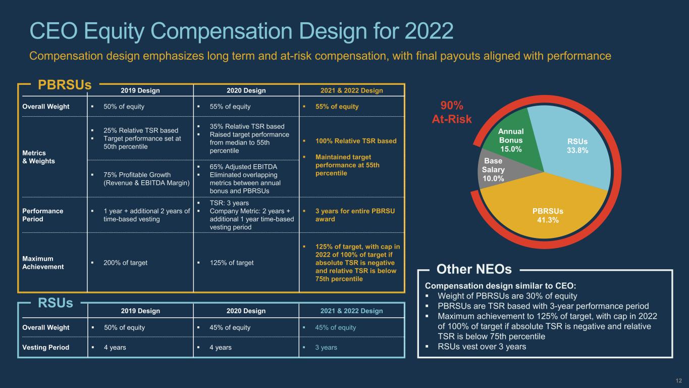 2019 Design 2020 Design 2021 & 2022 Design Overall Weight  50% of equity  55% of equity  55% of equity Metrics & Weights  25% Relative TSR based  Target performance set at 50th percentile  35% Relative TSR based  Raised target performance from median to 55th percentile  100% Relative TSR based  Maintained target performance at 55th percentile 75% Profitable Growth (Revenue & EBITDA Margin)  65% Adjusted EBITDA  Eliminated overlapping metrics between annual bonus and PBRSUs Performance Period  1 year + additional 2 years of time-based vesting  TSR: 3 years  Company Metric: 2 years + additional 1 year time-based vesting period  3 years for entire PBRSU award Maximum Achievement  200% of target  125% of target  125% of target, with cap in 2022 of 100% of target if absolute TSR is negative and relative TSR is below 75th percentile Base Salary 10.0% Annual Bonus 15.0% RSUs 33.8% PBRSUs 41.3% 90% At-Risk 12 CEO Equity Compensation Design for 2022 PBRSUs Compensation design similar to CEO:  Weight of PBRSUs are 30% of equity  PBRSUs are TSR based with 3-year performance period  Maximum achievement to 125% of target, with cap in 2022 of 100% of target if absolute TSR is negative and relative TSR is below 75th percentile  RSUs vest over 3 years Other NEOs RSUs 2019 Design 2020 Design 2021 & 2022 Design Overall Weight  50% of equity  45% of equity  45% of equity Vesting Period  4 years  4 years  3 years Compensation design emphasizes long term and at-risk compensation, with final payouts aligned with performance