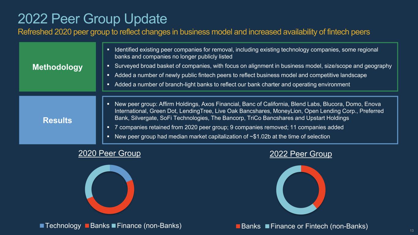 13 2022 Peer Group Update Refreshed 2020 peer group to reflect changes in business model and increased availability of fintech peers Results  New peer group: Affirm Holdings, Axos Financial, Banc of California, Blend Labs, Blucora, Domo, Enova International, Green Dot, LendingTree, Live Oak Bancshares, MoneyLion, Open Lending Corp., Preferred Bank, Silvergate, SoFi Technologies, The Bancorp, TriCo Bancshares and Upstart Holdings  7 companies retained from 2020 peer group; 9 companies removed; 11 companies added  New peer group had median market capitalization of ~$1.02b at the time of selection 2020 Peer Group Technology Banks Finance (non-Banks) 2022 Peer Group Banks Finance or Fintech (non-Banks) Methodology  Identified existing peer companies for removal, including existing technology companies, some regional banks and companies no longer publicly listed  Surveyed broad basket of companies, with focus on alignment in business model, size/scope and geography  Added a number of newly public fintech peers to reflect business model and competitive landscape  Added a number of branch-light banks to reflect our bank charter and operating environment