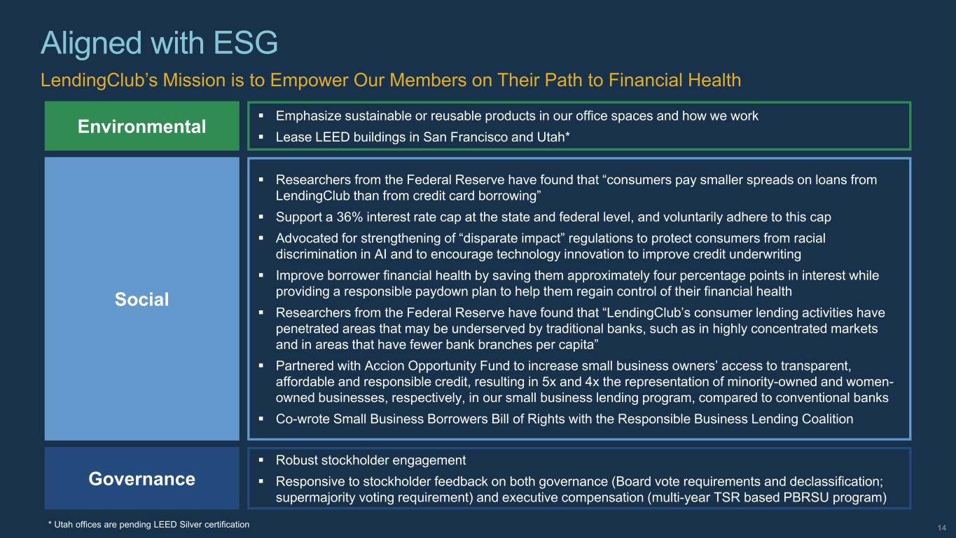 Aligned with ESG 14 LendingClub’s Mission is to Empower Our Members on Their Path to Financial Health Social  Researchers from the Federal Reserve have found that “consumers pay smaller spreads on loans from LendingClub than from credit card borrowing”  Support a 36% interest rate cap at the state and federal level, and voluntarily adhere to this cap  Advocated for strengthening of “disparate impact” regulations to protect consumers from racial discrimination in AI and to encourage technology innovation to improve credit underwriting  Improve borrower financial health by saving them approximately four percentage points in interest while providing a responsible paydown plan to help them regain control of their financial health  Researchers from the Federal Reserve have found that “LendingClub’s consumer lending activities have penetrated areas that may be underserved by traditional banks, such as in highly concentrated markets and in areas that have fewer bank branches per capita”  Partnered with Accion Opportunity Fund to increase small business owners’ access to transparent, affordable and responsible credit, resulting in 5x and 4x the representation of minority-owned and women- owned businesses, respectively, in our small business lending program, compared to conventional banks  Co-wrote Small Business Borrowers Bill of Rights with the Responsible Business Lending Coalition Environmental  Emphasize sustainable or reusable products in our office spaces and how we work  Lease LEED buildings in San Francisco and Utah* Governance  Robust stockholder engagement  Responsive to stockholder feedback on both governance (Board vote requirements and declassification; supermajority voting requirement) and executive compensation (multi-year TSR based PBRSU program) * Utah offices are pending LEED Silver certification