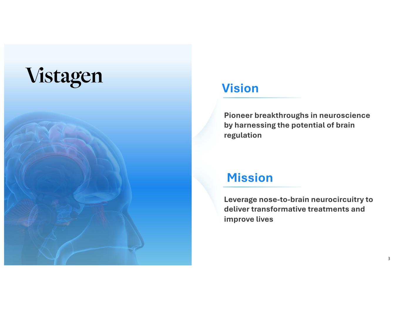 2 Forward-looking Statements This presentation contains certain forward-looking statements within the meaning of the Private Securities Litigation Reform Act of 1995 that are within the meaning of federal securities laws. These forward-looking statements involve known and unknown risks that are difficult to predict and include all matters that are not historical facts. In some cases, you can identify forward-looking statements by the use of words such as “may,” “could,” “expect,” “project,” “outlook,” “strategy,” “intend,” “plan,” “seek,” “anticipate,” “believe,” “estimate,” “predict,” “potential,” “strive,” “goal,” “continue,” “likely,” “will,” “would” and variations of these terms and similar expressions, or the negative of these terms or similar expressions. Such forward-looking statements are necessarily based upon estimates and assumptions that, while considered reasonable by Vistagen Therapeutics, Inc. (Vistagen or the Company) and its management, are inherently uncertain. As with all pharmaceutical products, there are substantial risks and uncertainties in the process of development and commercialization, and actual results or developments may differ materially from those projected or implied in these forward- looking statements. There can be no guarantee that any of the Company’s product candidates will successfully complete ongoing or future clinical trials within estimated timelines or at all, receive regulatory approval or be commercially successful. Other factors that may cause such a difference include, without limitation, risks and uncertainties relating to conducting and/or completing planned and/or ongoing clinical and non-clinical trials, including those that are a part of Vistagen’s PALISADE Phase 3 program, as currently expected or at all; Vistagen’s ability to ability to successfully employ cash preservation measures and/or secure adequate financing for its operations, including financing or collaborative support for continued clinical development of its product candidates; Vistagen's dependence on third-party collaborators for the development, regulatory approval, and/or commercialization of its product candidates and other aspects of its business, which are outside of Vistagen's full control; risks associated with current and potential future healthcare reforms; the scope and enforceability of Vistagen’s patents, including patents related to Vistagen’s pherine product candidates; fluctuating costs of materials and other resources and services required to conduct Vistagen’s planned and/or ongoing clinical and non-clinical trials; market conditions; the impact of general economic, industry or political conditions in the United States or internationally; and other technical and unexpected hurdles in the development, manufacture and commercialization of Vistagen’s product candidates. These risks are more fully discussed in the section entitled “Risk Factors” in Vistagen’s Annual Report on Form 10-K for the fiscal year ended March 31, 2025, and Quarterly Report on Form 10-Q for the period ended December 31, 2025, as well as discussions of potential risks, uncertainties, and other important factors in our other filings with the U.S. Securities and Exchange Commission (SEC). The Company’s SEC filings are available on the SEC’s website at www.sec.gov. Given these uncertainties, you should not place undue reliance on these forward-looking statements, which apply only as of the date of this presentation and should not be relied upon as representing the Company’s views as of any subsequent date. The Company explicitly disclaims any obligation to update any forward-looking statements other than as may be required by law. If the Company does update one or more forward-looking statements, no inference should be made that we will make additional updates with respect to those or other forward-looking statements. Be aware that our development and commercialization plans may change at any time, without public notice, based on the kinds of risk factors described above. This presentation also contains estimates and other statistical data made by independent parties and by us relating to market size and growth and other data about our industry. These data involve numerous assumptions and limitations, and you are cautioned not to give undue weight to such estimates and data. Neither we nor any other person makes any representation as to the accuracy or completeness of such data or undertakes any obligation to update such data after the date of this presentation.