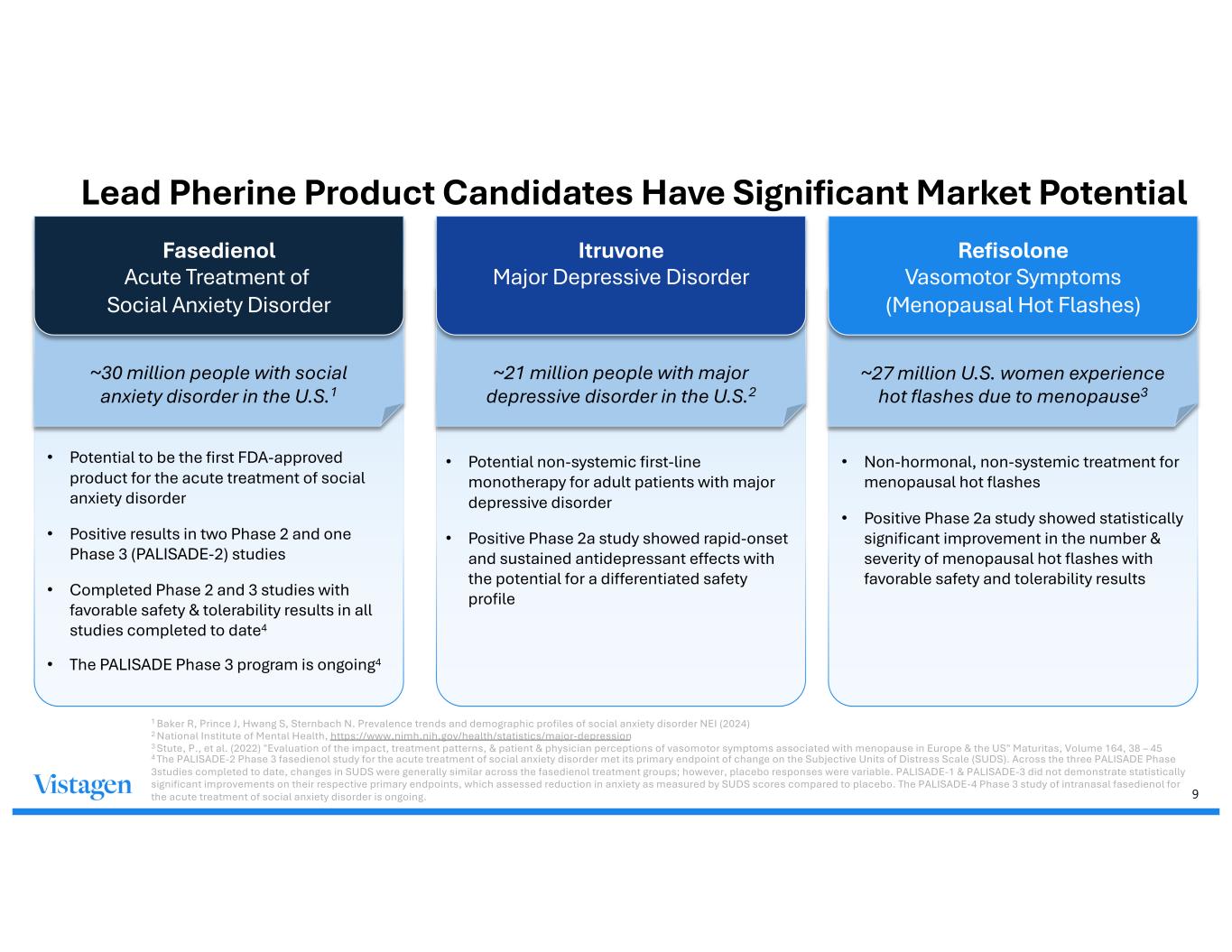 8 Product Candidate Indication(s) Preclinical Phase 1 Phase 2 Phase 3 Neuropsychiatry Fasedienol Acute Treatment of Social Anxiety Disorder Itruvone Major Depressive Disorder PH15 Psychomotor / cognitive impairment due to mental fatigue1 Women’s Health Refisolone VMS (hot flashes) due to menopause Premenstrual Dysphoric Disorder1 PH284 Cancer Cachexia1 Cancer Supportive Care Clinical-Stage Intranasal Pherine Product Candidates 1U.S. IND-enabling activities are necessary to facilitate further Phase 2 clinical development in the U.S.