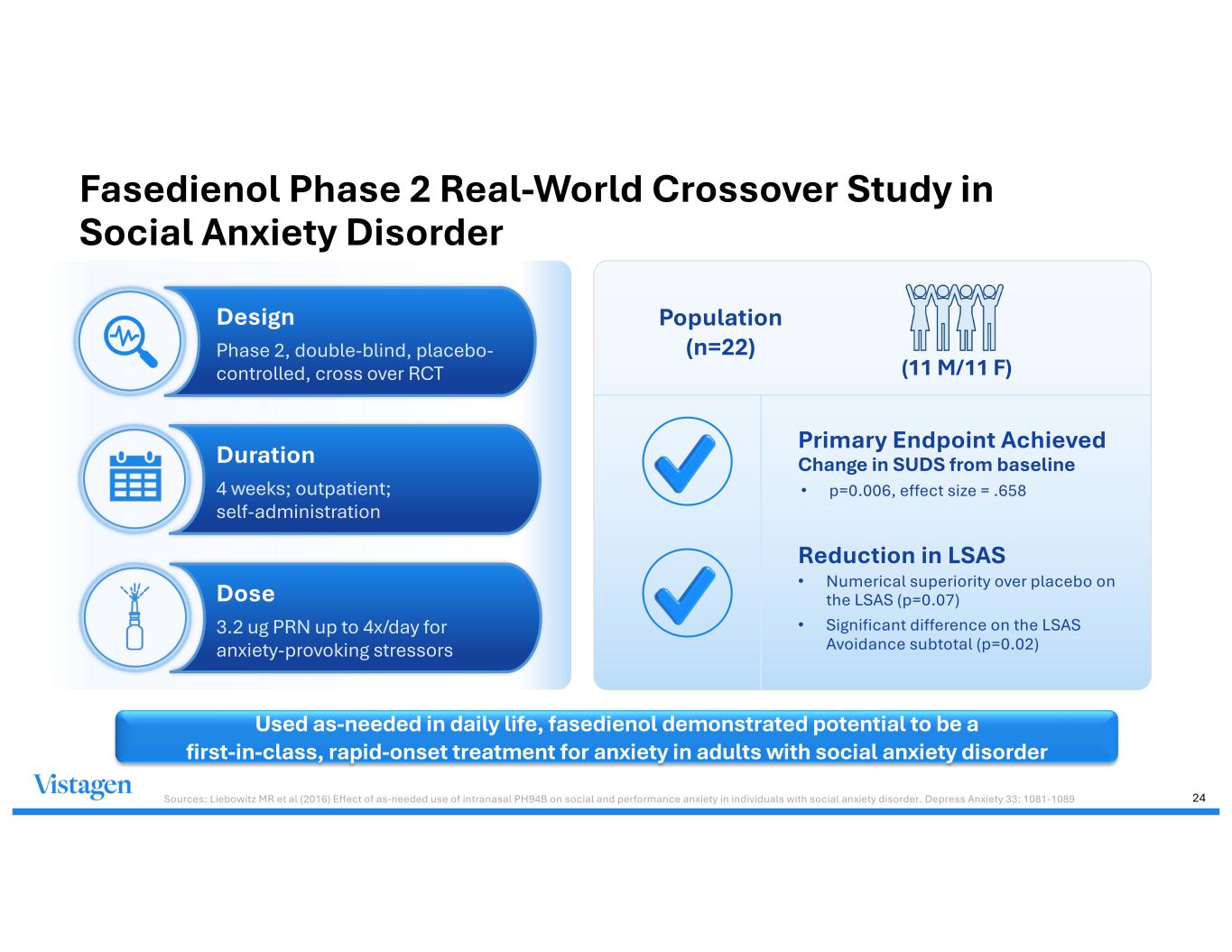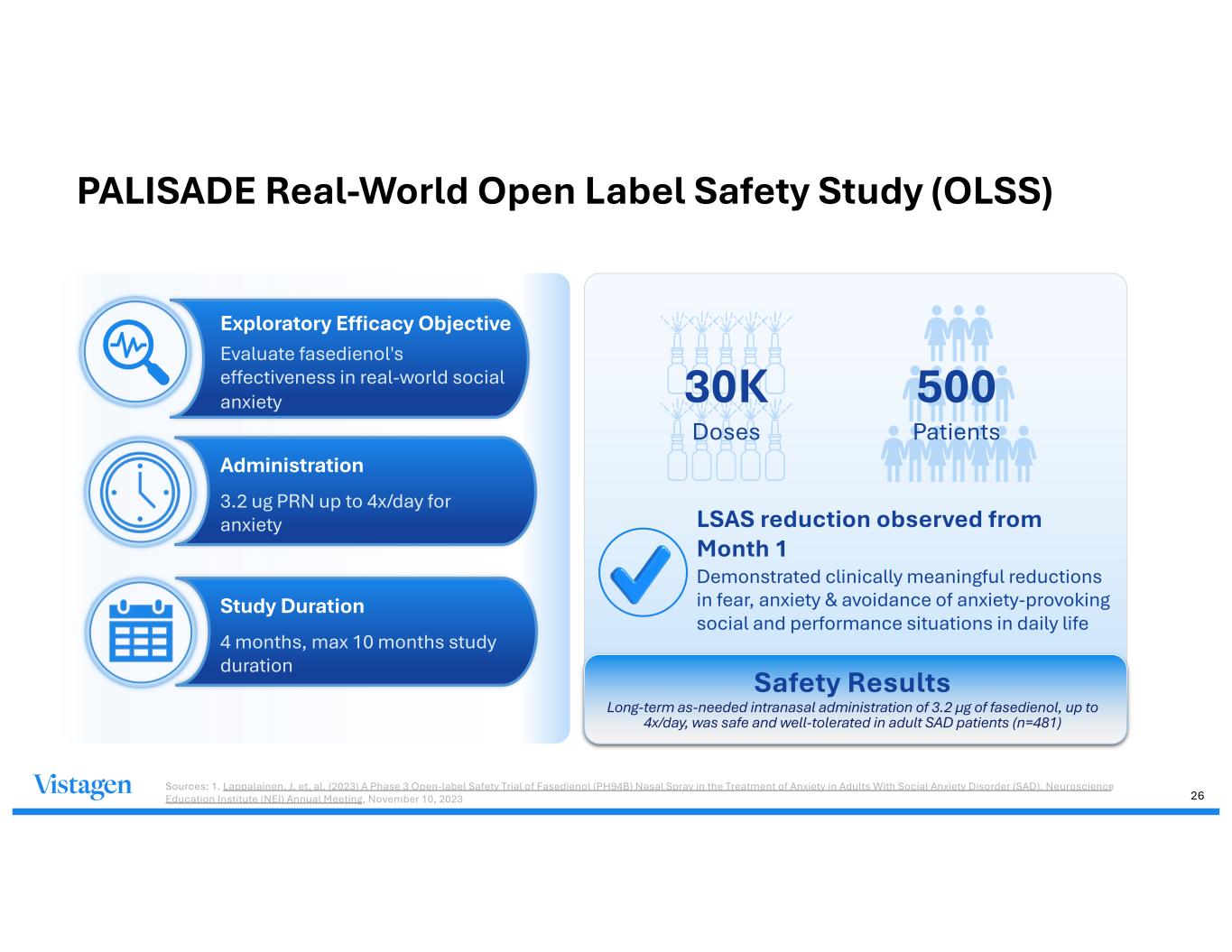 • On the primary endpoint, mean change from baseline in peak SUDS score, fasedienol (–15.60) was superior vs placebo (-8.34, p=.006, ES=0.83) • At W2, -15.9 vs -6.9, fasedienol vs placebo, respectively (p=0.192, ES=0.576) • Peak SUDS scores in fasedienol group increased after crossover to placebo but did not return to baseline (suggesting positive carryover effects from prior fasedienol treatment) • After 2 weeks, average LSAS scores decreased by -23.2 points with fasedienol vs - 8.2 with placebo, showing a trend difference (p=0.07) and a large effect size (ES=0.812) • In the full sample (n=22), LSAS score reductions did not differ between groups because participants who received fasedienol first continued to improve after crossover to placebo, likely due to carryover effects from prior fasedienol treatment 70 65 60 55 50 Baseline Week 1 Week 2 Week 3 Week 4 SU D S Fasedienol Placebo 100 90 80 70 60 LS A S Fasedienol Placebo Baseline Week 1 Week 2 Week 3 Week 4 Sources: 1. Liebowitz MR et al. (2016) Effect of as-needed use of intranasal PH94B on social and performance anxiety in individuals with social anxiety disorder. Depress Anxiety 33: 1081-1089, 2. Internal Vistagen Data on File Phase 2 Real-World Crossover Study Results (SUDS & LSAS): Acute use of fasedienol in real-world anxiety-provoking social & performance situations in daily life Peak SUDS at Baseline and Weeks 1-4 LSAS at Baseline and Week 1-4 25