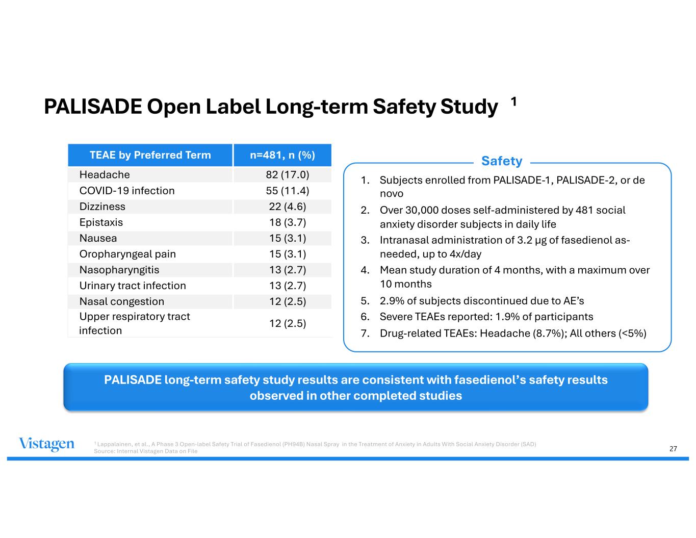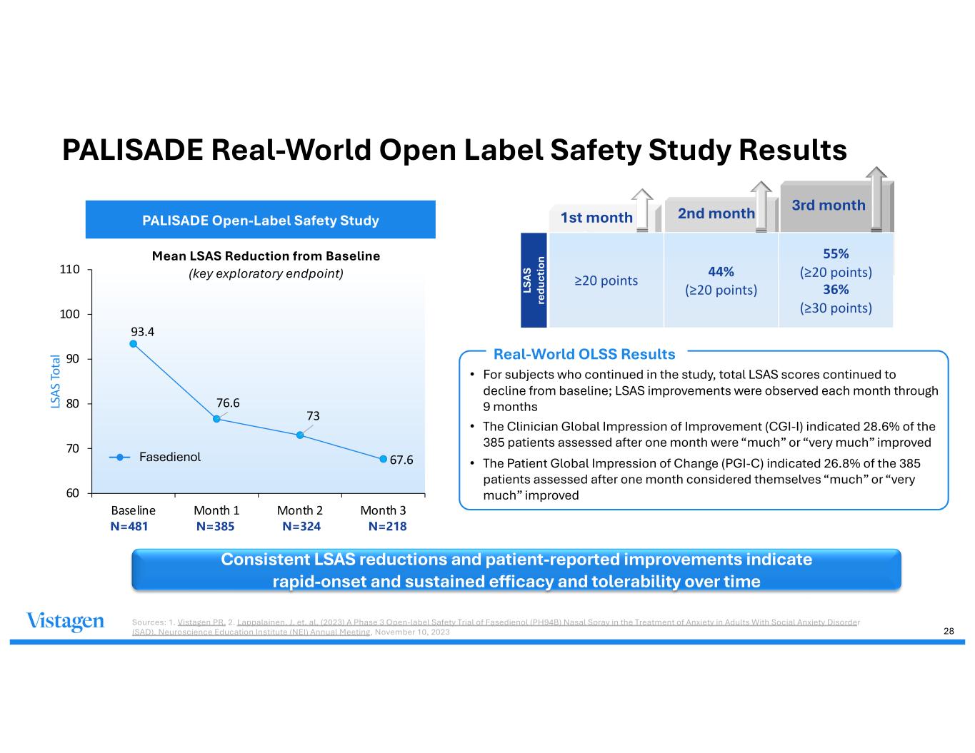 27 TEAE by Preferred Term n=481, n (%) Headache 82 (17.0) COVID-19 infection 55 (11.4) Dizziness 22 (4.6) Epistaxis 18 (3.7) Nausea 15 (3.1) Oropharyngeal pain 15 (3.1) Nasopharyngitis 13 (2.7) Urinary tract infection 13 (2.7) Nasal congestion 12 (2.5) Upper respiratory tract infection 12 (2.5) 1. Subjects enrolled from PALISADE-1, PALISADE-2, or de novo 2. Over 30,000 doses self-administered by 481 social anxiety disorder subjects in daily life 3. Intranasal administration of 3.2 μg of fasedienol as- needed, up to 4x/day 4. Mean study duration of 4 months, with a maximum over 10 months 5. 2.9% of subjects discontinued due to AE’s 6. Severe TEAEs reported: 1.9% of participants 7. Drug-related TEAEs: Headache (8.7%); All others (<5%) PALISADE Open Label Long-term Safety Study PALISADE long-term safety study results are consistent with fasedienol’s safety results observed in other completed studies 1 Lappalainen, et al., A Phase 3 Open-label Safety Trial of Fasedienol (PH94B) Nasal Spray in the Treatment of Anxiety in Adults With Social Anxiety Disorder (SAD) Source: Internal Vistagen Data on File 1 Safety