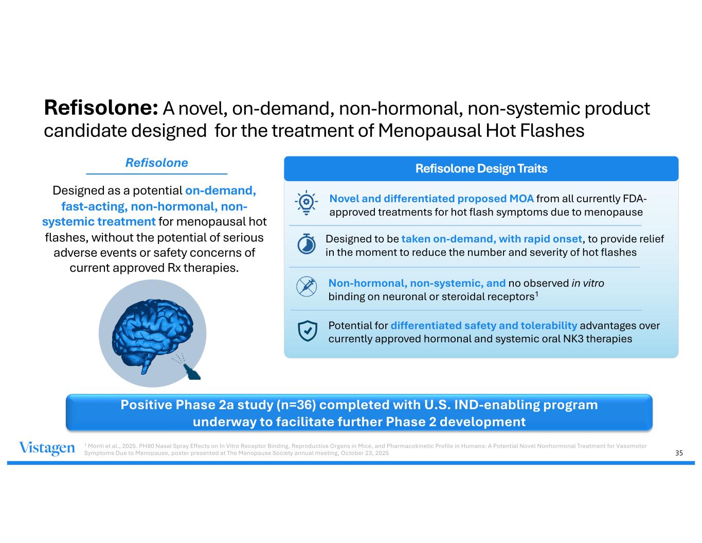 34 A Significant Portion of Menopausal Women Experience Vasomotor Symptoms (Hot Flashes) ~27M women in the U.S.1,2,3 ~9M suffering with severe form of hot flashes1,2,3,4 Symptoms persist for a median of 7.4 years6 Hot flashes are the most common symptoms of menopause for which women seek treatment5 Approximately 75% of all women in the US experience hot flashes during the menopausal transition1,2,3 1Internal Vistagen Data on File 2 Williams RE, et al. Frequency and severity of vasomotor symptoms among peri- and postmenopausal women in the United States. Climacteric. 2008 Feb;11(1):32-43. 3 Premenopausal vasomotor symptoms in an ethnically diverse population –PubMed (https://pubmed.ncbi.nlm.nih.gov/23760434/) 4 Global cross-sectional survey of women with vasomotor symptoms associated with menopause; prevalence and quality of life burden – PMC (https://pmc.ncbi.nlm.nih.gov/articles/PMC8746897/) 5 Williams RE, Kalilani L, DiBenedetti DB, Zhou X, Fehnel SE, Clark RV., Healthcare seeking and treatment for menopausal symptoms in the United States (2007) 6 Avis NE, Crawford SL, Greendale G, Bromberger JT, Everson-Rose SA, Gold EB, et al., Duration of menopausal vasomotor symptoms over the menopause transition (2015) JAMA Intern Med. 2015;175:531-9