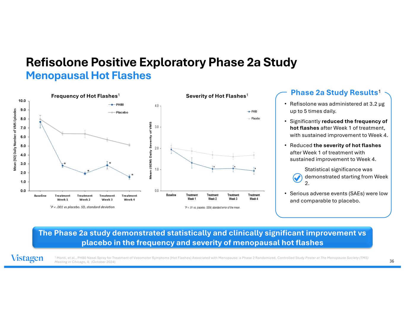 35 Refisolone: A novel, on-demand, non-hormonal, non-systemic product candidate designed for the treatment of Menopausal Hot Flashes Designed as a potential on-demand, fast-acting, non-hormonal, non- systemic treatment for menopausal hot flashes, without the potential of serious adverse events or safety concerns of current approved Rx therapies. Refisolone Design Traits Novel and differentiated proposed MOA from all currently FDA- approved treatments for hot flash symptoms due to menopause Designed to be taken on-demand, with rapid onset, to provide relief in the moment to reduce the number and severity of hot flashes Non-hormonal, non-systemic, and no observed in vitro binding on neuronal or steroidal receptors1 Potential for differentiated safety and tolerability advantages over currently approved hormonal and systemic oral NK3 therapies Refisolone Positive Phase 2a study (n=36) completed with U.S. IND-enabling program underway to facilitate further Phase 2 development 1 Monti et al., 2025. PH80 Nasal Spray Effects on In Vitro Receptor Binding, Reproductive Organs in Mice, and Pharmacokinetic Profile in Humans: A Potential Novel Nonhormonal Treatment for Vasomotor Symptoms Due to Menopause, poster presented at The Menopause Society annual meeting, October 23, 2025
