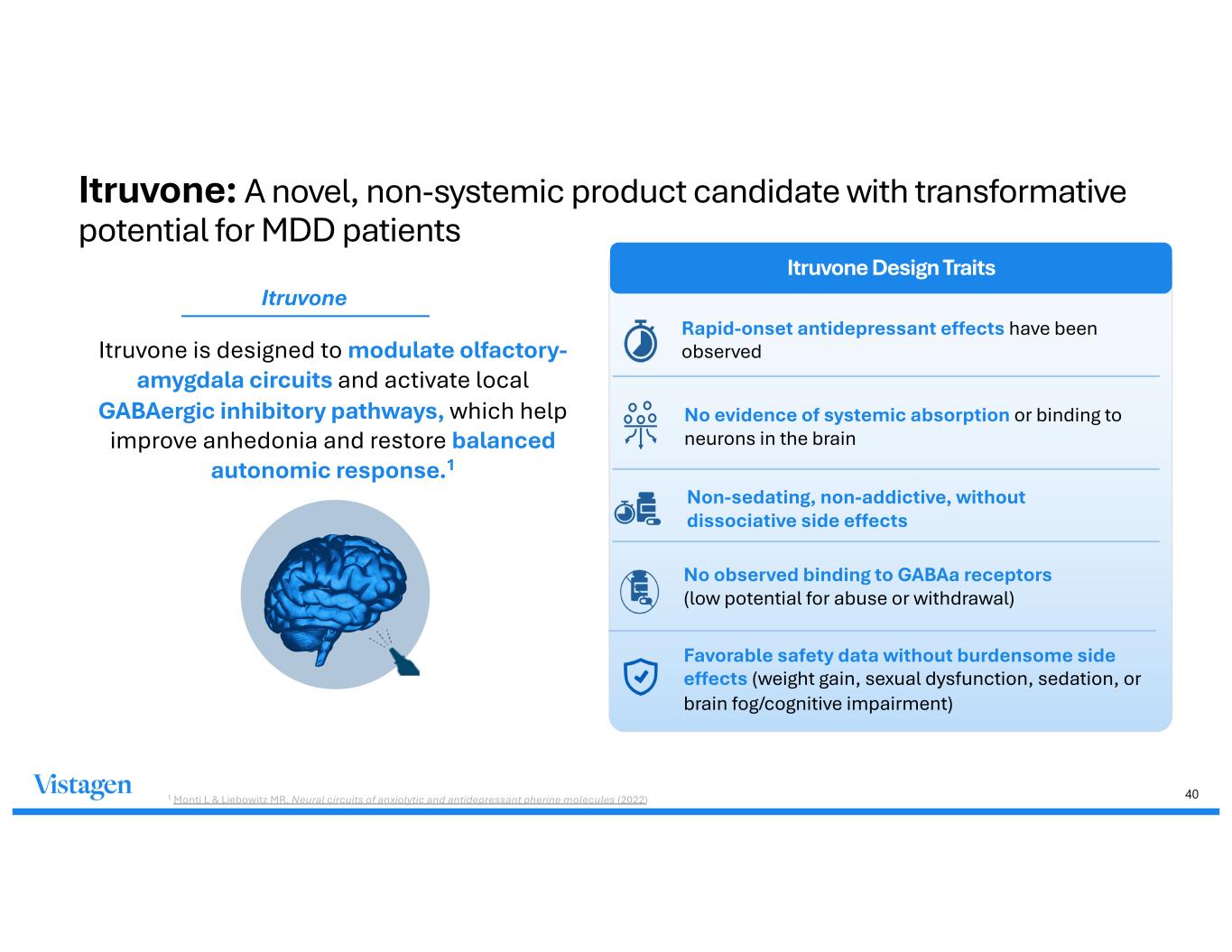 39 Major Depressive Disorder Market is Large and Underserved (Drug classes: SSRIs, SNRIs, NDRI, 5-HT1A, TCAs, MAOIs) • Often do not work or are slow to work • STAR*D showed ADT# effective in 1 of 3 patients3 • Significant and persistent side effects reported • Anxiety, weight gain, sexual dysfunction, insomnia, sedation, dizziness, vomiting, headache, sweating • Serious side effects reported & safety concerns • Increased suicidal ideation, hypertension, QT prolongation, liver damage, serotonin syndrome For many MDD patients, the current standard of care for treating depression is inadequate U.S. ~21 million Adults had at least one major depressive episode in 2021, 8.4% of all adults1 Global ~300 million People of all ages suffer from depression2 *Sequenced Treatment Alternatives to Relive Depression; #Antidepressant Therapy 1 National Institute of Mental Health. (2023). “Prevalence of Major Depressive Episode Among Adults.” 2 World Health Organization. (2025). Depressive disorder (depression). Fact sheets 3 Trivedi et al., 2006 AJ, et al., Acute and longer-term outcomes in depressed outpatients requiring one or several treatment steps: a STAR*D report (2006)et al., 2006 Oral Antidepressants3 (Approved: Abilify®, Rexulti®, Seroquel®, Vraylar®, and Caplyta®) • Variable effectiveness • Significant side effects • Weight gain, tardive dyskinesia, stomach pain, tiredness, dizziness, headache, nervousness, cognitive impairment • Serious safety concerns • Metabolic syndrome, Neuroleptic malignant syndrome, seizures, agranulocytosis, GI hypomotility Oral Atypical Antipsychotics3