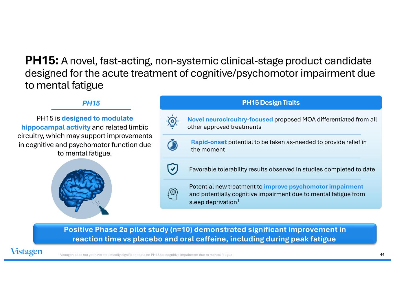 44 PH15: A novel, fast-acting, non-systemic clinical-stage product candidate designed for the acute treatment of cognitive/psychomotor impairment due to mental fatigue PH15 is designed to modulate hippocampal activity and related limbic circuitry, which may support improvements in cognitive and psychomotor function due to mental fatigue. PH15 Design Traits Novel neurocircuitry-focused proposed MOA differentiated from all other approved treatments Rapid-onset potential to be taken as-needed to provide relief in the moment Favorable tolerability results observed in studies completed to date Potential new treatment to improve psychomotor impairment and potentially cognitive impairment due to mental fatigue from sleep deprivation1 PH15 Positive Phase 2a pilot study (n=10) demonstrated significant improvement in reaction time vs placebo and oral caffeine, including during peak fatigue 1 Vistagen does not yet have statistically significant data on PH15 for cognitive impairment due to mental fatigue