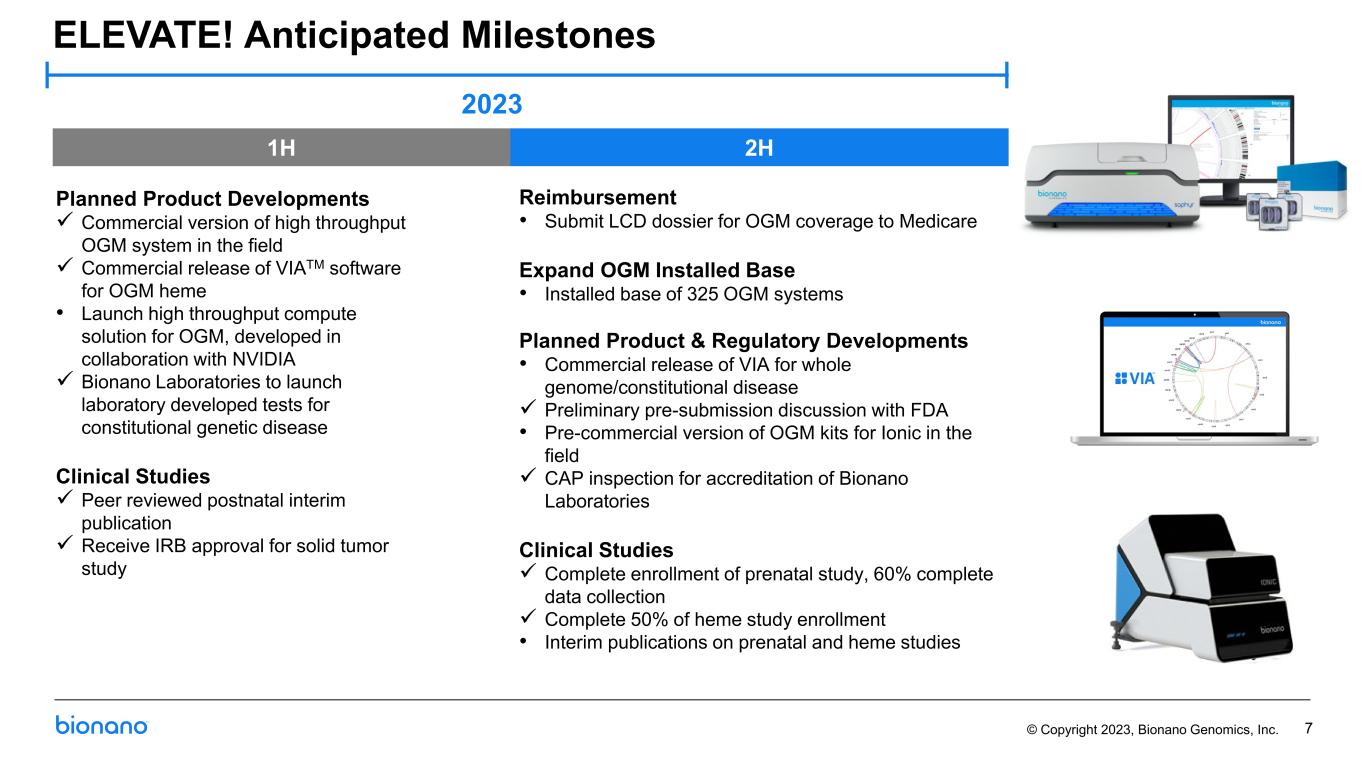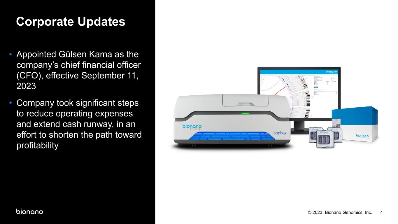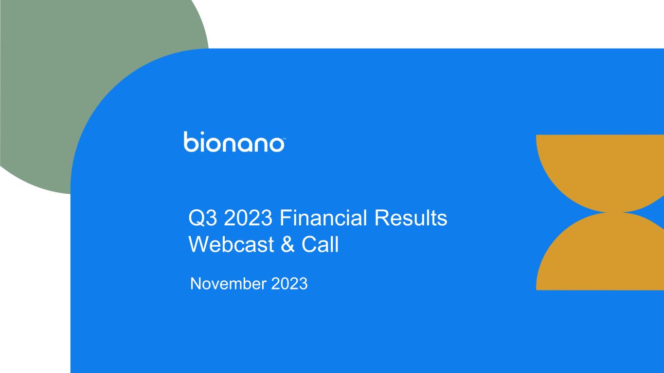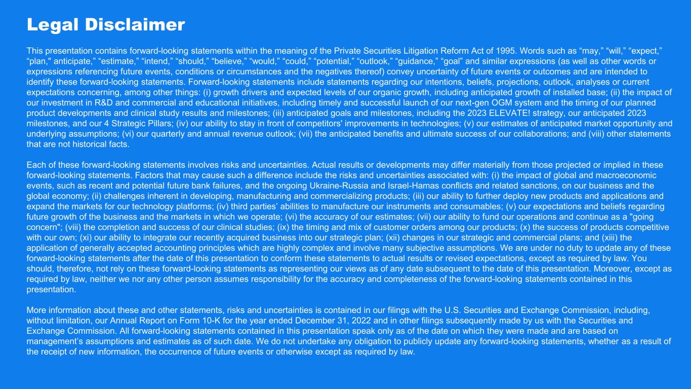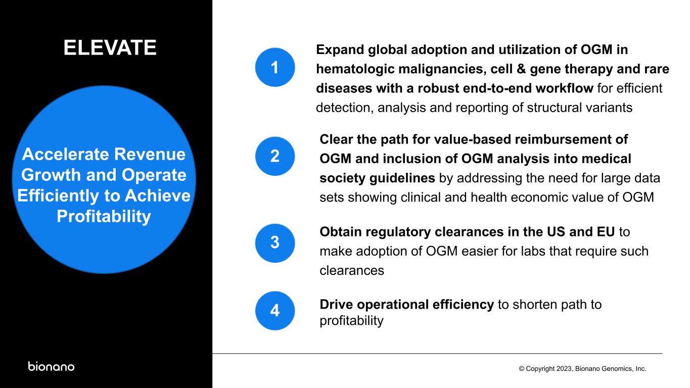 © Copyright 2023, Bionano Genomics, Inc. Legal Disclaimer This presentation contains forward-looking statements within the meaning of the Private Securities Litigation Reform Act of 1995. Words such as “may,” “will,” “expect,” “plan," anticipate,” “estimate,” “intend,” “should,” “believe,” “would,” “could,” “potential,” “outlook,” “guidance,” “goal” and similar expressions (as well as other words or expressions referencing future events, conditions or circumstances and the negatives thereof) convey uncertainty of future events or outcomes and are intended to identify these forward-looking statements. Forward-looking statements include statements regarding our intentions, beliefs, projections, outlook, analyses or current expectations concerning, among other things: (i) growth drivers and expected levels of our organic growth, including anticipated growth of installed base; (ii) the impact of our investment in R&D and commercial and educational initiatives, including timely and successful launch of our next-gen OGM system and the timing of our planned product developments and clinical study results and milestones; (iii) anticipated goals and milestones, including the 2023 ELEVATE! strategy, our anticipated 2023 milestones, and our 4 Strategic Pillars; (iv) our ability to stay in front of competitors' improvements in technologies; (v) our estimates of anticipated market opportunity and underlying assumptions; (vi) our quarterly and annual revenue outlook; (vii) the anticipated benefits and ultimate success of our collaborations; and (viii) other statements that are not historical facts. Each of these forward-looking statements involves risks and uncertainties. Actual results or developments may differ materially from those projected or implied in these forward-looking statements. Factors that may cause such a difference include the risks and uncertainties associated with: (i) the impact of global and macroeconomic events, such as recent and potential future bank failures, and the ongoing Ukraine-Russia and Israel-Hamas conflicts and related sanctions, on our business and the global economy; (ii) challenges inherent in developing, manufacturing and commercializing products; (iii) our ability to further deploy new products and applications and expand the markets for our technology platforms; (iv) third parties’ abilities to manufacture our instruments and consumables; (v) our expectations and beliefs regarding future growth of the business and the markets in which we operate; (vi) the accuracy of our estimates; (vii) our ability to fund our operations and continue as a "going concern"; (viii) the completion and success of our clinical studies; (ix) the timing and mix of customer orders among our products; (x) the success of products competitive with our own; (xi) our ability to integrate our recently acquired business into our strategic plan; (xii) changes in our strategic and commercial plans; and (xiii) the application of generally accepted accounting principles which are highly complex and involve many subjective assumptions. We are under no duty to update any of these forward-looking statements after the date of this presentation to conform these statements to actual results or revised expectations, except as required by law. You should, therefore, not rely on these forward-looking statements as representing our views as of any date subsequent to the date of this presentation. Moreover, except as required by law, neither we nor any other person assumes responsibility for the accuracy and completeness of the forward-looking statements contained in this presentation. More information about these and other statements, risks and uncertainties is contained in our filings with the U.S. Securities and Exchange Commission, including, without limitation, our Annual Report on Form 10-K for the year ended December 31, 2022 and in other filings subsequently made by us with the Securities and Exchange Commission. All forward-looking statements contained in this presentation speak only as of the date on which they were made and are based on management’s assumptions and estimates as of such date. We do not undertake any obligation to publicly update any forward-looking statements, whether as a result of the receipt of new information, the occurrence of future events or otherwise except as required by law.