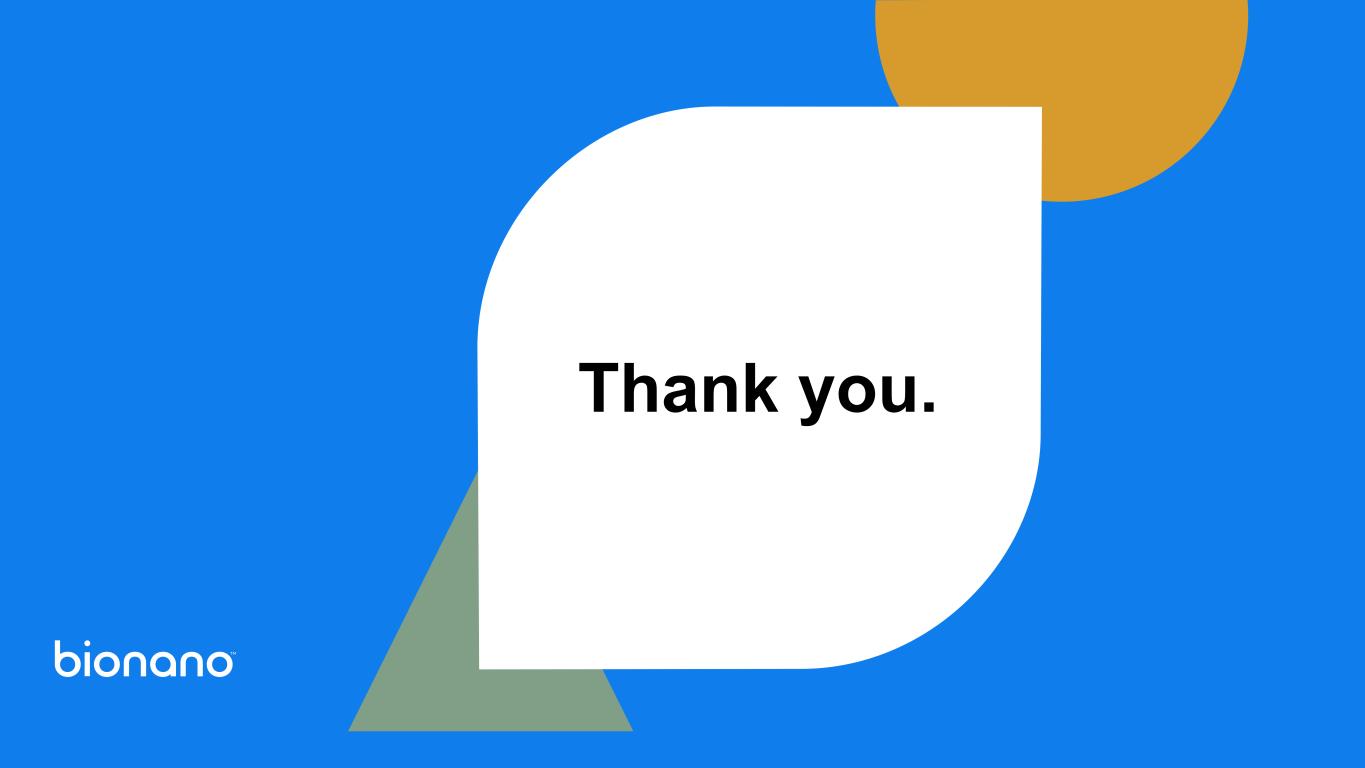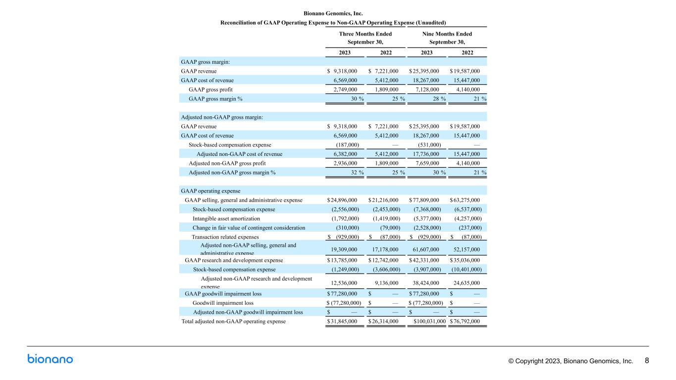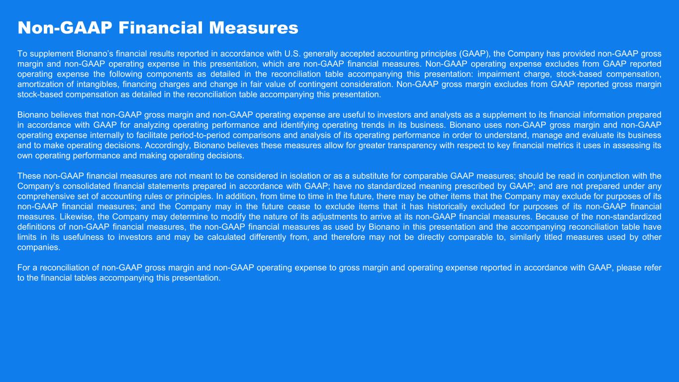 © Copyright 2023, Bionano Genomics, Inc. Non-GAAP Financial Measures To supplement Bionano’s financial results reported in accordance with U.S. generally accepted accounting principles (GAAP), the Company has provided non-GAAP gross margin and non-GAAP operating expense in this presentation, which are non-GAAP financial measures. Non-GAAP operating expense excludes from GAAP reported operating expense the following components as detailed in the reconciliation table accompanying this presentation: impairment charge, stock-based compensation, amortization of intangibles, financing charges and change in fair value of contingent consideration. Non-GAAP gross margin excludes from GAAP reported gross margin stock-based compensation as detailed in the reconciliation table accompanying this presentation. Bionano believes that non-GAAP gross margin and non-GAAP operating expense are useful to investors and analysts as a supplement to its financial information prepared in accordance with GAAP for analyzing operating performance and identifying operating trends in its business. Bionano uses non-GAAP gross margin and non-GAAP operating expense internally to facilitate period-to-period comparisons and analysis of its operating performance in order to understand, manage and evaluate its business and to make operating decisions. Accordingly, Bionano believes these measures allow for greater transparency with respect to key financial metrics it uses in assessing its own operating performance and making operating decisions. These non-GAAP financial measures are not meant to be considered in isolation or as a substitute for comparable GAAP measures; should be read in conjunction with the Company’s consolidated financial statements prepared in accordance with GAAP; have no standardized meaning prescribed by GAAP; and are not prepared under any comprehensive set of accounting rules or principles. In addition, from time to time in the future, there may be other items that the Company may exclude for purposes of its non-GAAP financial measures; and the Company may in the future cease to exclude items that it has historically excluded for purposes of its non-GAAP financial measures. Likewise, the Company may determine to modify the nature of its adjustments to arrive at its non-GAAP financial measures. Because of the non-standardized definitions of non-GAAP financial measures, the non-GAAP financial measures as used by Bionano in this presentation and the accompanying reconciliation table have limits in its usefulness to investors and may be calculated differently from, and therefore may not be directly comparable to, similarly titled measures used by other companies. For a reconciliation of non-GAAP gross margin and non-GAAP operating expense to gross margin and operating expense reported in accordance with GAAP, please refer to the financial tables accompanying this presentation.