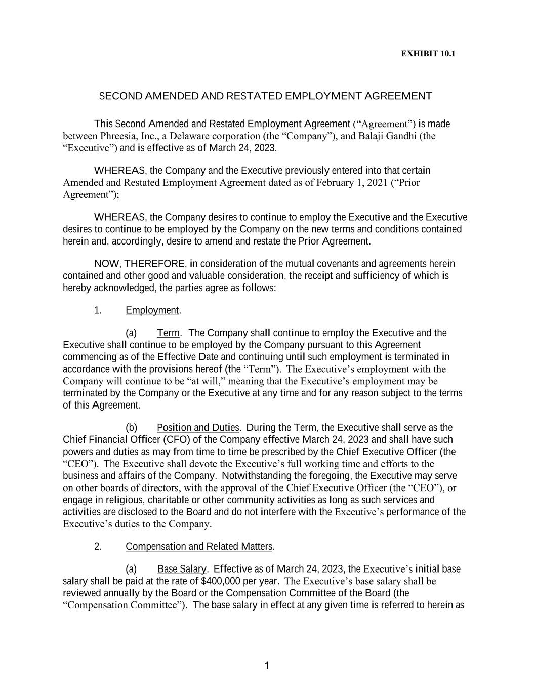 SECOND AMENDED AND RESTATED EMPLOYMENT AGREEMENT This Second Amended and Restated Employment Agreement (“Agreement”) is made between Phreesia, Inc., a Delaware corporation (the “Company”), and Balaji Gandhi (the “Executive”) and is effective as of March 24, 2023. WHEREAS, the Company and the Executive previously entered into that certain Amended and Restated Employment Agreement dated as of February 1, 2021 (“Prior Agreement”); WHEREAS, the Company desires to continue to employ the Executive and the Executive desires to continue to be employed by the Company on the new terms and conditions contained herein and, accordingly, desire to amend and restate the Prior Agreement. NOW, THEREFORE, in consideration of the mutual covenants and agreements herein contained and other good and valuable consideration, the receipt and sufficiency of which is hereby acknowledged, the parties agree as follows: 1. Employment. (a) Term. The Company shall continue to employ the Executive and the Executive shall continue to be employed by the Company pursuant to this Agreement commencing as of the Effective Date and continuing until such employment is terminated in accordance with the provisions hereof (the “Term”). The Executive’s employment with the Company will continue to be “at will,” meaning that the Executive’s employment may be terminated by the Company or the Executive at any time and for any reason subject to the terms of this Agreement. (b) Position and Duties. During the Term, the Executive shall serve as the Chief Financial Officer (CFO) of the Company effective March 24, 2023 and shall have such powers and duties as may from time to time be prescribed by the Chief Executive Officer (the “CEO”). The Executive shall devote the Executive’s full working time and efforts to the business and affairs of the Company. Notwithstanding the foregoing, the Executive may serve on other boards of directors, with the approval of the Chief Executive Officer (the “CEO”), or engage in religious, charitable or other community activities as long as such services and activities are disclosed to the Board and do not interfere with the Executive’s performance of the Executive’s duties to the Company. 2. Compensation and Related Matters. (a) Base Salary. Effective as of March 24, 2023, the Executive’s initial base salary shall be paid at the rate of $400,000 per year. The Executive’s base salary shall be reviewed annually by the Board or the Compensation Committee of the Board (the “Compensation Committee”). The base salary in effect at any given time is referred to herein as 1 EXHIBIT 10.1