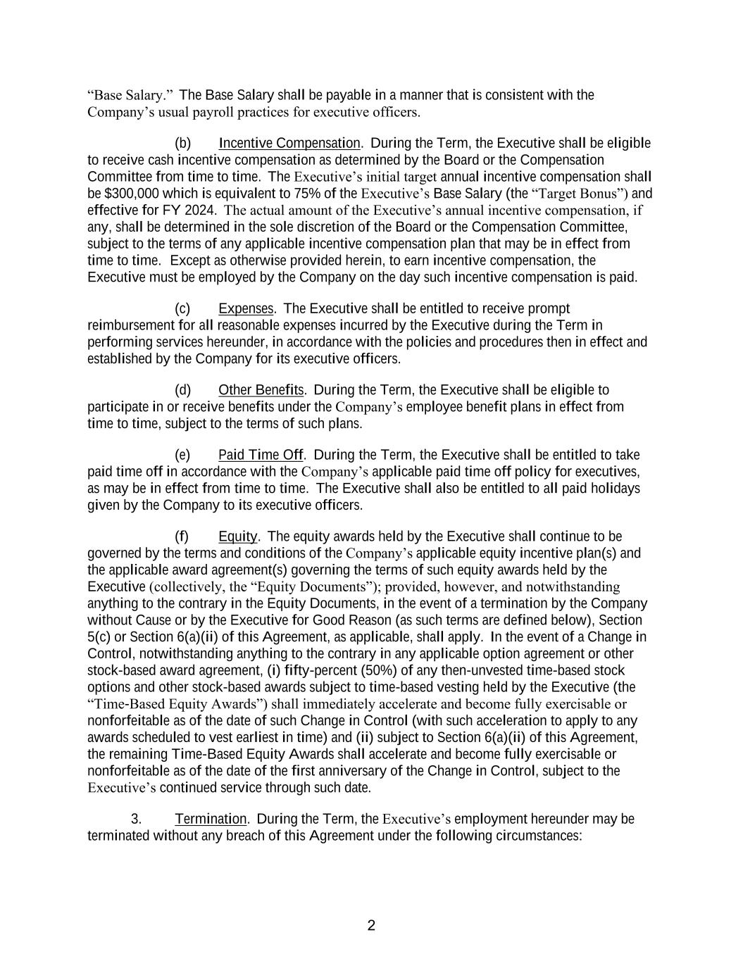 “Base Salary.” The Base Salary shall be payable in a manner that is consistent with the Company’s usual payroll practices for executive officers. (b) Incentive Compensation. During the Term, the Executive shall be eligible to receive cash incentive compensation as determined by the Board or the Compensation Committee from time to time. The Executive’s initial target annual incentive compensation shall be $300,000 which is equivalent to 75% of the Executive’s Base Salary (the “Target Bonus”) and effective for FY 2024. The actual amount of the Executive’s annual incentive compensation, if any, shall be determined in the sole discretion of the Board or the Compensation Committee, subject to the terms of any applicable incentive compensation plan that may be in effect from time to time. Except as otherwise provided herein, to earn incentive compensation, the Executive must be employed by the Company on the day such incentive compensation is paid. (c) Expenses. The Executive shall be entitled to receive prompt reimbursement for all reasonable expenses incurred by the Executive during the Term in performing services hereunder, in accordance with the policies and procedures then in effect and established by the Company for its executive officers. (d) Other Benefits. During the Term, the Executive shall be eligible to participate in or receive benefits under the Company’s employee benefit plans in effect from time to time, subject to the terms of such plans. (e) Paid Time Off. During the Term, the Executive shall be entitled to take paid time off in accordance with the Company’s applicable paid time off policy for executives, as may be in effect from time to time. The Executive shall also be entitled to all paid holidays given by the Company to its executive officers. (f) Equity. The equity awards held by the Executive shall continue to be governed by the terms and conditions of the Company’s applicable equity incentive plan(s) and the applicable award agreement(s) governing the terms of such equity awards held by the Executive (collectively, the “Equity Documents”); provided, however, and notwithstanding anything to the contrary in the Equity Documents, in the event of a termination by the Company without Cause or by the Executive for Good Reason (as such terms are defined below), Section 5(c) or Section 6(a)(ii) of this Agreement, as applicable, shall apply. In the event of a Change in Control, notwithstanding anything to the contrary in any applicable option agreement or other stock-based award agreement, (i) fifty-percent (50%) of any then-unvested time-based stock options and other stock-based awards subject to time-based vesting held by the Executive (the “Time-Based Equity Awards”) shall immediately accelerate and become fully exercisable or nonforfeitable as of the date of such Change in Control (with such acceleration to apply to any awards scheduled to vest earliest in time) and (ii) subject to Section 6(a)(ii) of this Agreement, the remaining Time-Based Equity Awards shall accelerate and become fully exercisable or nonforfeitable as of the date of the first anniversary of the Change in Control, subject to the Executive’s continued service through such date. 3. Termination. During the Term, the Executive’s employment hereunder may be terminated without any breach of this Agreement under the following circumstances: 2