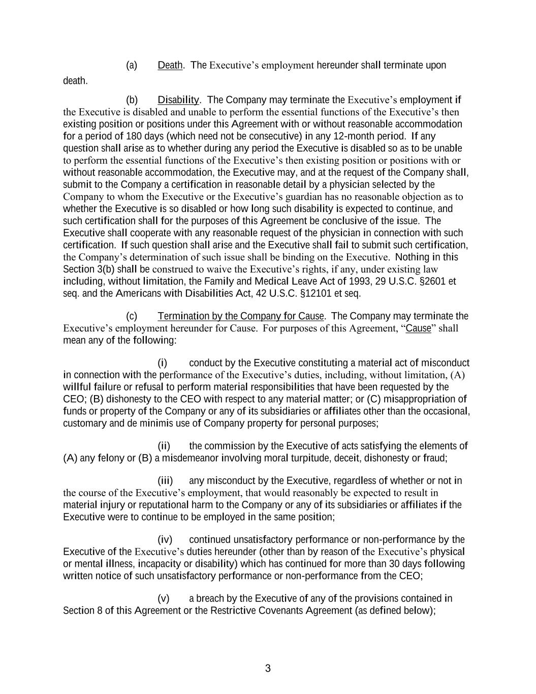 death. (a) Death. The Executive’s employment hereunder shall terminate upon (b) Disability. The Company may terminate the Executive’s employment if the Executive is disabled and unable to perform the essential functions of the Executive’s then existing position or positions under this Agreement with or without reasonable accommodation for a period of 180 days (which need not be consecutive) in any 12-month period. If any question shall arise as to whether during any period the Executive is disabled so as to be unable to perform the essential functions of the Executive’s then existing position or positions with or without reasonable accommodation, the Executive may, and at the request of the Company shall, submit to the Company a certification in reasonable detail by a physician selected by the Company to whom the Executive or the Executive’s guardian has no reasonable objection as to whether the Executive is so disabled or how long such disability is expected to continue, and such certification shall for the purposes of this Agreement be conclusive of the issue. The Executive shall cooperate with any reasonable request of the physician in connection with such certification. If such question shall arise and the Executive shall fail to submit such certification, the Company’s determination of such issue shall be binding on the Executive. Nothing in this Section 3(b) shall be construed to waive the Executive’s rights, if any, under existing law including, without limitation, the Family and Medical Leave Act of 1993, 29 U.S.C. §2601 et seq. and the Americans with Disabilities Act, 42 U.S.C. §12101 et seq. (c) Termination by the Company for Cause. The Company may terminate the Executive’s employment hereunder for Cause. For purposes of this Agreement, “Cause” shall mean any of the following: (i) conduct by the Executive constituting a material act of misconduct in connection with the performance of the Executive’s duties, including, without limitation, (A) willful failure or refusal to perform material responsibilities that have been requested by the CEO; (B) dishonesty to the CEO with respect to any material matter; or (C) misappropriation of funds or property of the Company or any of its subsidiaries or affiliates other than the occasional, customary and de minimis use of Company property for personal purposes; (ii) the commission by the Executive of acts satisfying the elements of (A) any felony or (B) a misdemeanor involving moral turpitude, deceit, dishonesty or fraud; (iii) any misconduct by the Executive, regardless of whether or not in the course of the Executive’s employment, that would reasonably be expected to result in material injury or reputational harm to the Company or any of its subsidiaries or affiliates if the Executive were to continue to be employed in the same position; (iv) continued unsatisfactory performance or non-performance by the Executive of the Executive’s duties hereunder (other than by reason of the Executive’s physical or mental illness, incapacity or disability) which has continued for more than 30 days following written notice of such unsatisfactory performance or non-performance from the CEO; (v) a breach by the Executive of any of the provisions contained in Section 8 of this Agreement or the Restrictive Covenants Agreement (as defined below); 3