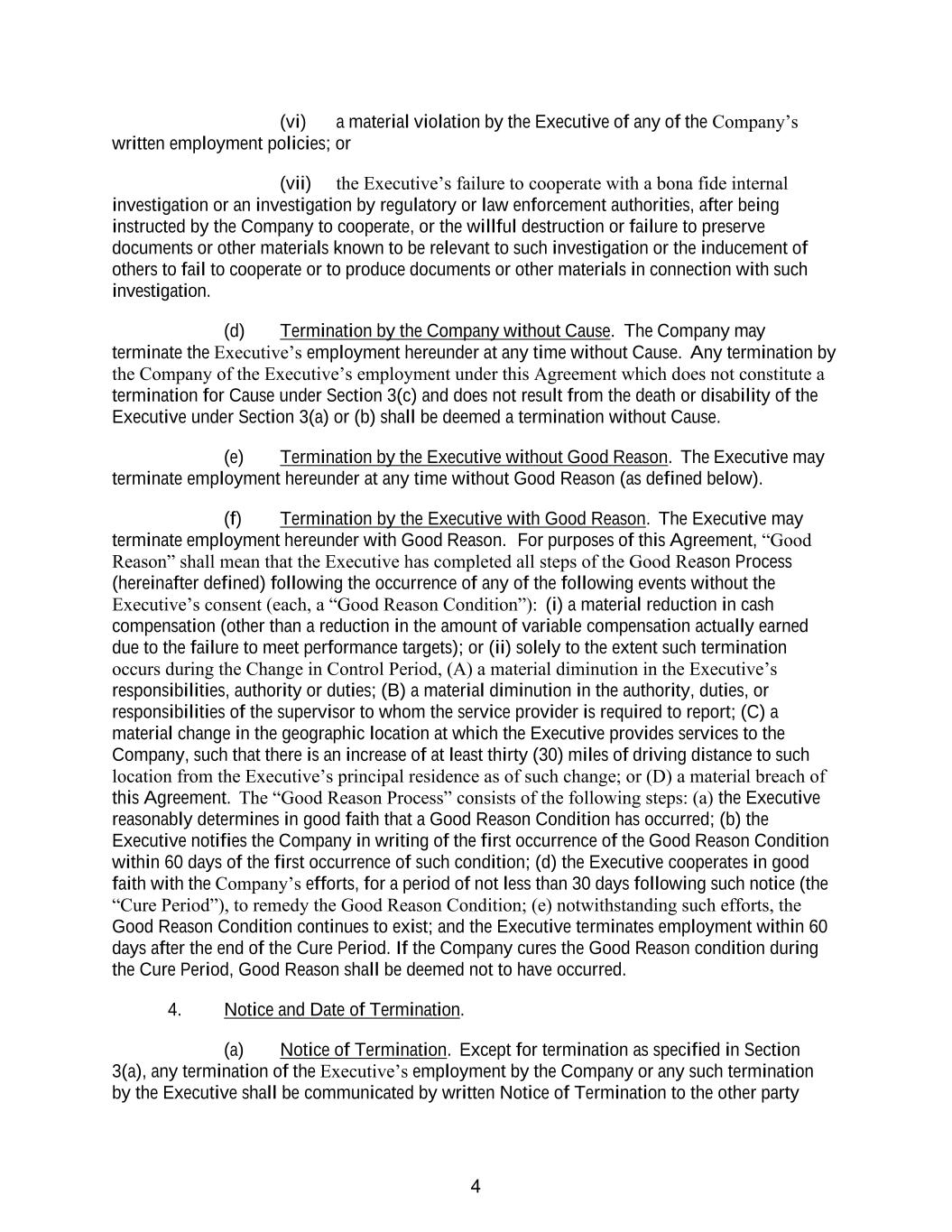 (vi) a material violation by the Executive of any of the Company’s written employment policies; or (vii) the Executive’s failure to cooperate with a bona fide internal investigation or an investigation by regulatory or law enforcement authorities, after being instructed by the Company to cooperate, or the willful destruction or failure to preserve documents or other materials known to be relevant to such investigation or the inducement of others to fail to cooperate or to produce documents or other materials in connection with such investigation. (d) Termination by the Company without Cause. The Company may terminate the Executive’s employment hereunder at any time without Cause. Any termination by the Company of the Executive’s employment under this Agreement which does not constitute a termination for Cause under Section 3(c) and does not result from the death or disability of the Executive under Section 3(a) or (b) shall be deemed a termination without Cause. (e) Termination by the Executive without Good Reason. The Executive may terminate employment hereunder at any time without Good Reason (as defined below). (f) Termination by the Executive with Good Reason. The Executive may terminate employment hereunder with Good Reason. For purposes of this Agreement, “Good Reason” shall mean that the Executive has completed all steps of the Good Reason Process (hereinafter defined) following the occurrence of any of the following events without the Executive’s consent (each, a “Good Reason Condition”): (i) a material reduction in cash compensation (other than a reduction in the amount of variable compensation actually earned due to the failure to meet performance targets); or (ii) solely to the extent such termination occurs during the Change in Control Period, (A) a material diminution in the Executive’s responsibilities, authority or duties; (B) a material diminution in the authority, duties, or responsibilities of the supervisor to whom the service provider is required to report; (C) a material change in the geographic location at which the Executive provides services to the Company, such that there is an increase of at least thirty (30) miles of driving distance to such location from the Executive’s principal residence as of such change; or (D) a material breach of this Agreement. The “Good Reason Process” consists of the following steps: (a) the Executive reasonably determines in good faith that a Good Reason Condition has occurred; (b) the Executive notifies the Company in writing of the first occurrence of the Good Reason Condition within 60 days of the first occurrence of such condition; (d) the Executive cooperates in good faith with the Company’s efforts, for a period of not less than 30 days following such notice (the “Cure Period”), to remedy the Good Reason Condition; (e) notwithstanding such efforts, the Good Reason Condition continues to exist; and the Executive terminates employment within 60 days after the end of the Cure Period. If the Company cures the Good Reason condition during the Cure Period, Good Reason shall be deemed not to have occurred. 4. Notice and Date of Termination. (a) Notice of Termination. Except for termination as specified in Section 3(a), any termination of the Executive’s employment by the Company or any such termination by the Executive shall be communicated by written Notice of Termination to the other party 4