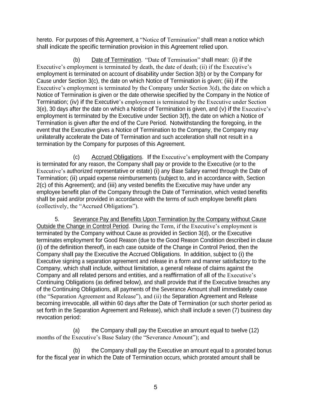 hereto. For purposes of this Agreement, a “Notice of Termination” shall mean a notice which shall indicate the specific termination provision in this Agreement relied upon. (b) Date of Termination. “Date of Termination” shall mean: (i) if the Executive’s employment is terminated by death, the date of death; (ii) if the Executive’s employment is terminated on account of disability under Section 3(b) or by the Company for Cause under Section 3(c), the date on which Notice of Termination is given; (iii) if the Executive’s employment is terminated by the Company under Section 3(d), the date on which a Notice of Termination is given or the date otherwise specified by the Company in the Notice of Termination; (iv) if the Executive’s employment is terminated by the Executive under Section 3(e), 30 days after the date on which a Notice of Termination is given, and (v) if the Executive’s employment is terminated by the Executive under Section 3(f), the date on which a Notice of Termination is given after the end of the Cure Period. Notwithstanding the foregoing, in the event that the Executive gives a Notice of Termination to the Company, the Company may unilaterally accelerate the Date of Termination and such acceleration shall not result in a termination by the Company for purposes of this Agreement. (c) Accrued Obligations. If the Executive’s employment with the Company is terminated for any reason, the Company shall pay or provide to the Executive (or to the Executive’s authorized representative or estate) (i) any Base Salary earned through the Date of Termination; (ii) unpaid expense reimbursements (subject to, and in accordance with, Section 2(c) of this Agreement); and (iii) any vested benefits the Executive may have under any employee benefit plan of the Company through the Date of Termination, which vested benefits shall be paid and/or provided in accordance with the terms of such employee benefit plans (collectively, the “Accrued Obligations”). 5. Severance Pay and Benefits Upon Termination by the Company without Cause Outside the Change in Control Period. During the Term, if the Executive’s employment is terminated by the Company without Cause as provided in Section 3(d), or the Executive terminates employment for Good Reason (due to the Good Reason Condition described in clause (i) of the definition thereof), in each case outside of the Change in Control Period, then the Company shall pay the Executive the Accrued Obligations. In addition, subject to (i) the Executive signing a separation agreement and release in a form and manner satisfactory to the Company, which shall include, without limitation, a general release of claims against the Company and all related persons and entities, and a reaffirmation of all of the Executive’s Continuing Obligations (as defined below), and shall provide that if the Executive breaches any of the Continuing Obligations, all payments of the Severance Amount shall immediately cease (the “Separation Agreement and Release”), and (ii) the Separation Agreement and Release becoming irrevocable, all within 60 days after the Date of Termination (or such shorter period as set forth in the Separation Agreement and Release), which shall include a seven (7) business day revocation period: (a) the Company shall pay the Executive an amount equal to twelve (12) months of the Executive’s Base Salary (the “Severance Amount”); and (b) the Company shall pay the Executive an amount equal to a prorated bonus for the fiscal year in which the Date of Termination occurs, which prorated amount shall be 5