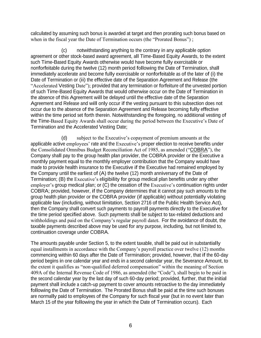 calculated by assuming such bonus is awarded at target and then prorating such bonus based on when in the fiscal year the Date of Termination occurs (the “Prorated Bonus”) ; (c) notwithstanding anything to the contrary in any applicable option agreement or other stock-based award agreement, all Time-Based Equity Awards, to the extent such Time-Based Equity Awards otherwise would have become fully exercisable or nonforfeitable during the twelve (12) month period following the Date of Termination, shall immediately accelerate and become fully exercisable or nonforfeitable as of the later of (i) the Date of Termination or (ii) the effective date of the Separation Agreement and Release (the “Accelerated Vesting Date”); provided that any termination or forfeiture of the unvested portion of such Time-Based Equity Awards that would otherwise occur on the Date of Termination in the absence of this Agreement will be delayed until the effective date of the Separation Agreement and Release and will only occur if the vesting pursuant to this subsection does not occur due to the absence of the Separation Agreement and Release becoming fully effective within the time period set forth therein. Notwithstanding the foregoing, no additional vesting of the Time-Based Equity Awards shall occur during the period between the Executive’s Date of Termination and the Accelerated Vesting Date; (d) subject to the Executive’s copayment of premium amounts at the applicable active employees’ rate and the Executive’s proper election to receive benefits under the Consolidated Omnibus Budget Reconciliation Act of 1985, as amended (“COBRA”), the Company shall pay to the group health plan provider, the COBRA provider or the Executive a monthly payment equal to the monthly employer contribution that the Company would have made to provide health insurance to the Executive if the Executive had remained employed by the Company until the earliest of (A) the twelve (12) month anniversary of the Date of Termination; (B) the Executive’s eligibility for group medical plan benefits under any other employer’s group medical plan; or (C) the cessation of the Executive’s continuation rights under COBRA; provided, however, if the Company determines that it cannot pay such amounts to the group health plan provider or the COBRA provider (if applicable) without potentially violating applicable law (including, without limitation, Section 2716 of the Public Health Service Act), then the Company shall convert such payments to payroll payments directly to the Executive for the time period specified above. Such payments shall be subject to tax-related deductions and withholdings and paid on the Company’s regular payroll dates. For the avoidance of doubt, the taxable payments described above may be used for any purpose, including, but not limited to, continuation coverage under COBRA. The amounts payable under Section 5, to the extent taxable, shall be paid out in substantially equal installments in accordance with the Company’s payroll practice over twelve (12) months commencing within 60 days after the Date of Termination; provided, however, that if the 60-day period begins in one calendar year and ends in a second calendar year, the Severance Amount, to the extent it qualifies as “non-qualified deferred compensation” within the meaning of Section 409A of the Internal Revenue Code of 1986, as amended (the “Code”), shall begin to be paid in the second calendar year by the last day of such 60-day period; provided, further, that the initial payment shall include a catch-up payment to cover amounts retroactive to the day immediately following the Date of Termination. The Prorated Bonus shall be paid at the time such bonuses are normally paid to employees of the Company for such fiscal year (but in no event later than March 15 of the year following the year in which the Date of Termination occurs). Each 6