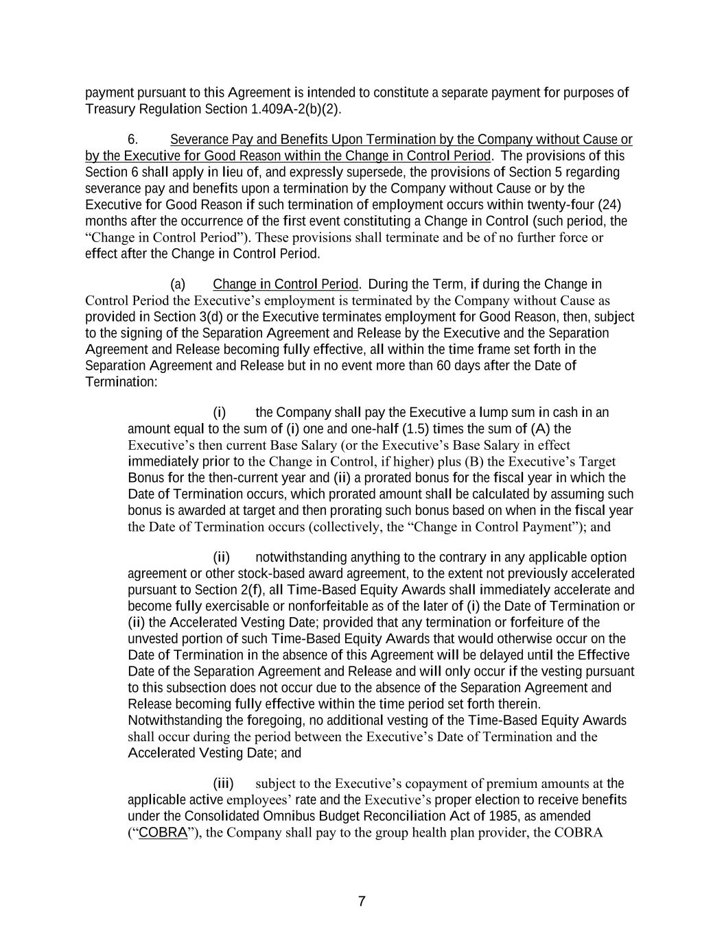 payment pursuant to this Agreement is intended to constitute a separate payment for purposes of Treasury Regulation Section 1.409A-2(b)(2). 6. Severance Pay and Benefits Upon Termination by the Company without Cause or by the Executive for Good Reason within the Change in Control Period. The provisions of this Section 6 shall apply in lieu of, and expressly supersede, the provisions of Section 5 regarding severance pay and benefits upon a termination by the Company without Cause or by the Executive for Good Reason if such termination of employment occurs within twenty-four (24) months after the occurrence of the first event constituting a Change in Control (such period, the “Change in Control Period”). These provisions shall terminate and be of no further force or effect after the Change in Control Period. (a) Change in Control Period. During the Term, if during the Change in Control Period the Executive’s employment is terminated by the Company without Cause as provided in Section 3(d) or the Executive terminates employment for Good Reason, then, subject to the signing of the Separation Agreement and Release by the Executive and the Separation Agreement and Release becoming fully effective, all within the time frame set forth in the Separation Agreement and Release but in no event more than 60 days after the Date of Termination: (i) the Company shall pay the Executive a lump sum in cash in an amount equal to the sum of (i) one and one-half (1.5) times the sum of (A) the Executive’s then current Base Salary (or the Executive’s Base Salary in effect immediately prior to the Change in Control, if higher) plus (B) the Executive’s Target Bonus for the then-current year and (ii) a prorated bonus for the fiscal year in which the Date of Termination occurs, which prorated amount shall be calculated by assuming such bonus is awarded at target and then prorating such bonus based on when in the fiscal year the Date of Termination occurs (collectively, the “Change in Control Payment”); and (ii) notwithstanding anything to the contrary in any applicable option agreement or other stock-based award agreement, to the extent not previously accelerated pursuant to Section 2(f), all Time-Based Equity Awards shall immediately accelerate and become fully exercisable or nonforfeitable as of the later of (i) the Date of Termination or (ii) the Accelerated Vesting Date; provided that any termination or forfeiture of the unvested portion of such Time-Based Equity Awards that would otherwise occur on the Date of Termination in the absence of this Agreement will be delayed until the Effective Date of the Separation Agreement and Release and will only occur if the vesting pursuant to this subsection does not occur due to the absence of the Separation Agreement and Release becoming fully effective within the time period set forth therein. Notwithstanding the foregoing, no additional vesting of the Time-Based Equity Awards shall occur during the period between the Executive’s Date of Termination and the Accelerated Vesting Date; and (iii) subject to the Executive’s copayment of premium amounts at the applicable active employees’ rate and the Executive’s proper election to receive benefits under the Consolidated Omnibus Budget Reconciliation Act of 1985, as amended (“COBRA”), the Company shall pay to the group health plan provider, the COBRA 7