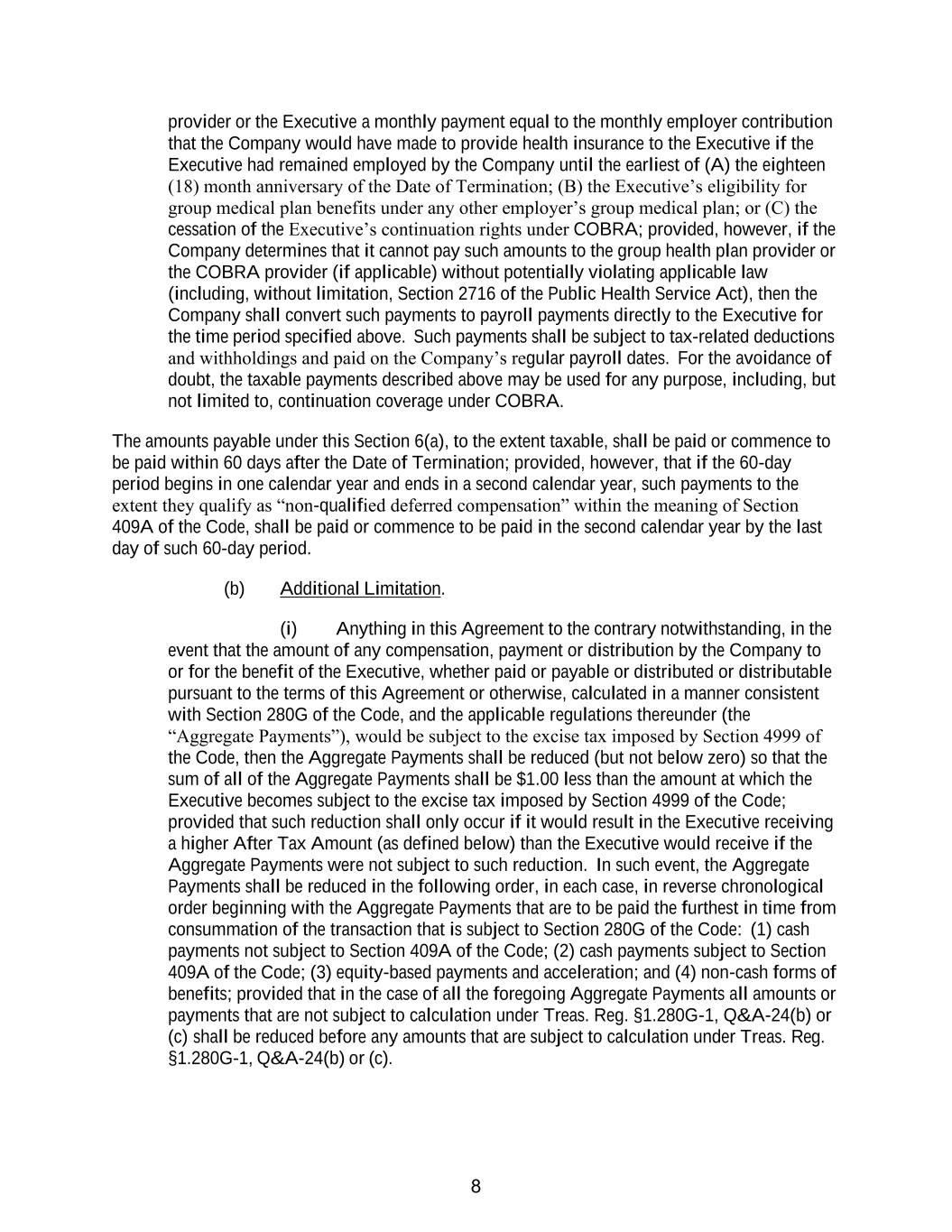 provider or the Executive a monthly payment equal to the monthly employer contribution that the Company would have made to provide health insurance to the Executive if the Executive had remained employed by the Company until the earliest of (A) the eighteen (18) month anniversary of the Date of Termination; (B) the Executive’s eligibility for group medical plan benefits under any other employer’s group medical plan; or (C) the cessation of the Executive’s continuation rights under COBRA; provided, however, if the Company determines that it cannot pay such amounts to the group health plan provider or the COBRA provider (if applicable) without potentially violating applicable law (including, without limitation, Section 2716 of the Public Health Service Act), then the Company shall convert such payments to payroll payments directly to the Executive for the time period specified above. Such payments shall be subject to tax-related deductions and withholdings and paid on the Company’s regular payroll dates. For the avoidance of doubt, the taxable payments described above may be used for any purpose, including, but not limited to, continuation coverage under COBRA. The amounts payable under this Section 6(a), to the extent taxable, shall be paid or commence to be paid within 60 days after the Date of Termination; provided, however, that if the 60-day period begins in one calendar year and ends in a second calendar year, such payments to the extent they qualify as “non-qualified deferred compensation” within the meaning of Section 409A of the Code, shall be paid or commence to be paid in the second calendar year by the last day of such 60-day period. (b) Additional Limitation. (i) Anything in this Agreement to the contrary notwithstanding, in the event that the amount of any compensation, payment or distribution by the Company to or for the benefit of the Executive, whether paid or payable or distributed or distributable pursuant to the terms of this Agreement or otherwise, calculated in a manner consistent with Section 280G of the Code, and the applicable regulations thereunder (the “Aggregate Payments”), would be subject to the excise tax imposed by Section 4999 of the Code, then the Aggregate Payments shall be reduced (but not below zero) so that the sum of all of the Aggregate Payments shall be $1.00 less than the amount at which the Executive becomes subject to the excise tax imposed by Section 4999 of the Code; provided that such reduction shall only occur if it would result in the Executive receiving a higher After Tax Amount (as defined below) than the Executive would receive if the Aggregate Payments were not subject to such reduction. In such event, the Aggregate Payments shall be reduced in the following order, in each case, in reverse chronological order beginning with the Aggregate Payments that are to be paid the furthest in time from consummation of the transaction that is subject to Section 280G of the Code: (1) cash payments not subject to Section 409A of the Code; (2) cash payments subject to Section 409A of the Code; (3) equity-based payments and acceleration; and (4) non-cash forms of benefits; provided that in the case of all the foregoing Aggregate Payments all amounts or payments that are not subject to calculation under Treas. Reg. §1.280G-1, Q&A-24(b) or (c) shall be reduced before any amounts that are subject to calculation under Treas. Reg. §1.280G-1, Q&A-24(b) or (c). 8
