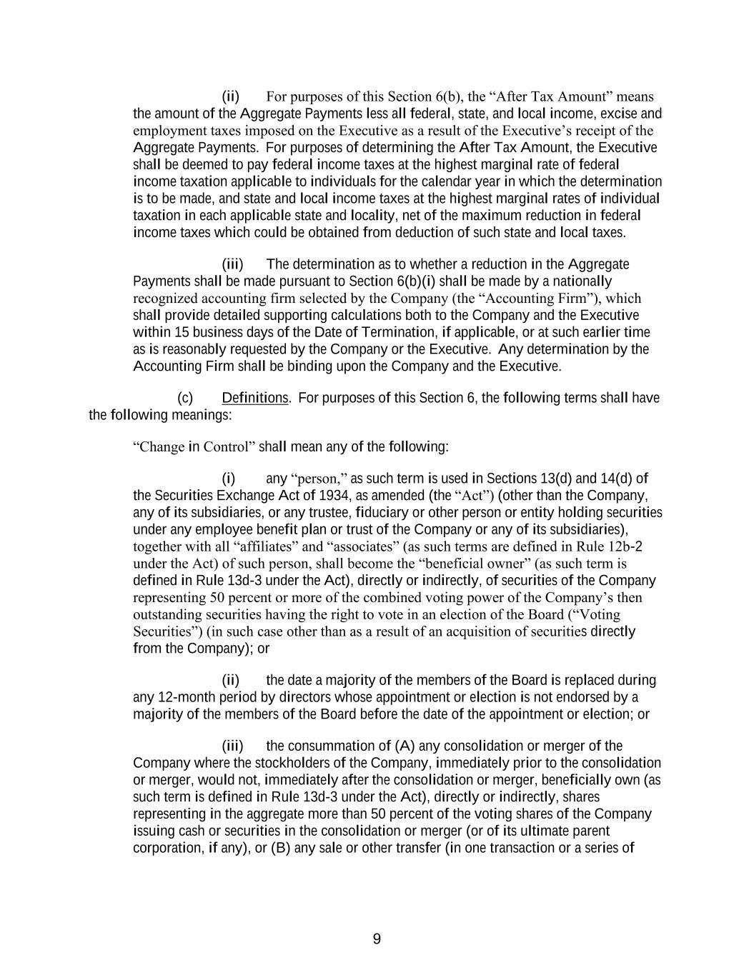 (ii) For purposes of this Section 6(b), the “After Tax Amount” means the amount of the Aggregate Payments less all federal, state, and local income, excise and employment taxes imposed on the Executive as a result of the Executive’s receipt of the Aggregate Payments. For purposes of determining the After Tax Amount, the Executive shall be deemed to pay federal income taxes at the highest marginal rate of federal income taxation applicable to individuals for the calendar year in which the determination is to be made, and state and local income taxes at the highest marginal rates of individual taxation in each applicable state and locality, net of the maximum reduction in federal income taxes which could be obtained from deduction of such state and local taxes. (iii) The determination as to whether a reduction in the Aggregate Payments shall be made pursuant to Section 6(b)(i) shall be made by a nationally recognized accounting firm selected by the Company (the “Accounting Firm”), which shall provide detailed supporting calculations both to the Company and the Executive within 15 business days of the Date of Termination, if applicable, or at such earlier time as is reasonably requested by the Company or the Executive. Any determination by the Accounting Firm shall be binding upon the Company and the Executive. (c) Definitions. For purposes of this Section 6, the following terms shall have the following meanings: “Change in Control” shall mean any of the following: (i) any “person,” as such term is used in Sections 13(d) and 14(d) of the Securities Exchange Act of 1934, as amended (the “Act”) (other than the Company, any of its subsidiaries, or any trustee, fiduciary or other person or entity holding securities under any employee benefit plan or trust of the Company or any of its subsidiaries), together with all “affiliates” and “associates” (as such terms are defined in Rule 12b-2 under the Act) of such person, shall become the “beneficial owner” (as such term is defined in Rule 13d-3 under the Act), directly or indirectly, of securities of the Company representing 50 percent or more of the combined voting power of the Company’s then outstanding securities having the right to vote in an election of the Board (“Voting Securities”) (in such case other than as a result of an acquisition of securities directly from the Company); or (ii) the date a majority of the members of the Board is replaced during any 12-month period by directors whose appointment or election is not endorsed by a majority of the members of the Board before the date of the appointment or election; or (iii) the consummation of (A) any consolidation or merger of the Company where the stockholders of the Company, immediately prior to the consolidation or merger, would not, immediately after the consolidation or merger, beneficially own (as such term is defined in Rule 13d-3 under the Act), directly or indirectly, shares representing in the aggregate more than 50 percent of the voting shares of the Company issuing cash or securities in the consolidation or merger (or of its ultimate parent corporation, if any), or (B) any sale or other transfer (in one transaction or a series of 9