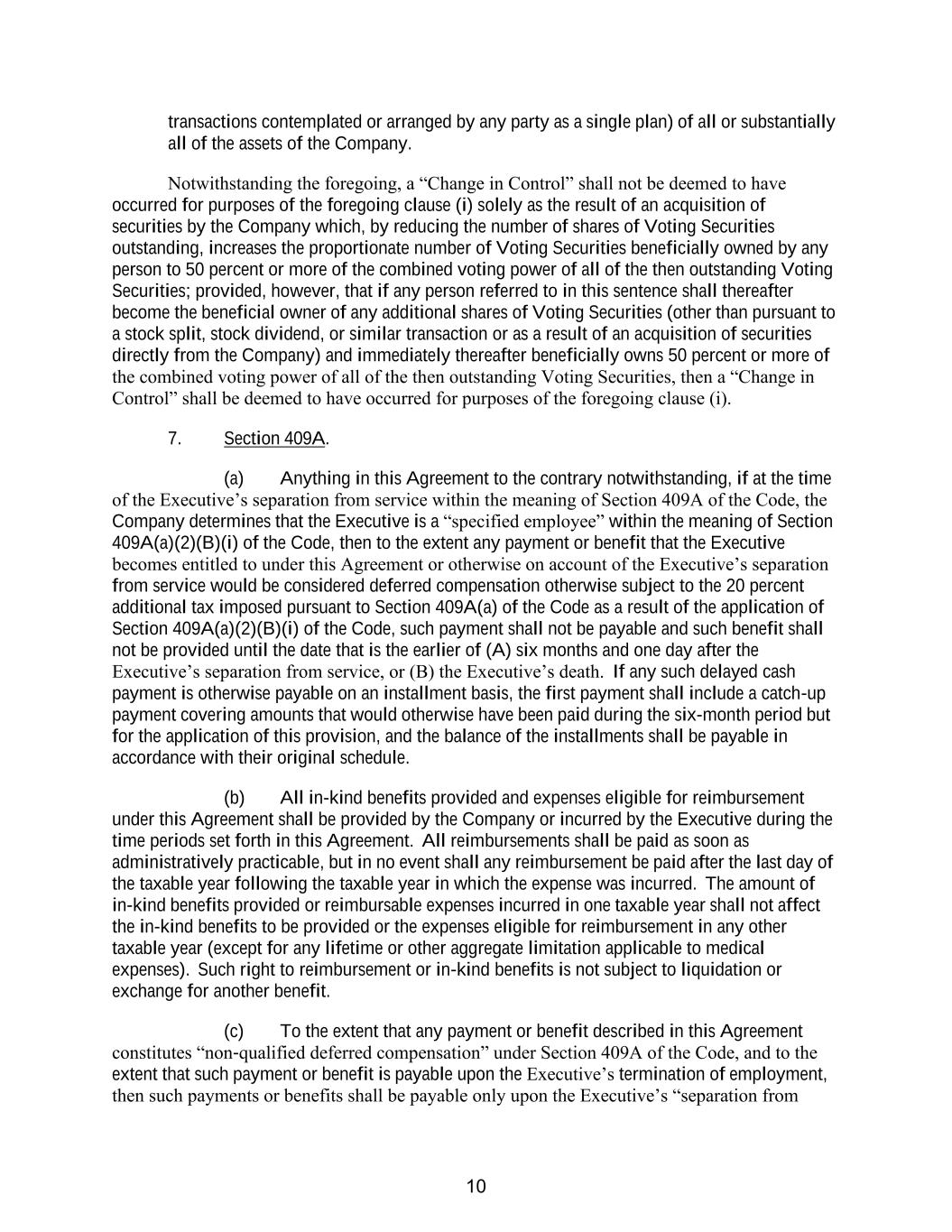 transactions contemplated or arranged by any party as a single plan) of all or substantially all of the assets of the Company. Notwithstanding the foregoing, a “Change in Control” shall not be deemed to have occurred for purposes of the foregoing clause (i) solely as the result of an acquisition of securities by the Company which, by reducing the number of shares of Voting Securities outstanding, increases the proportionate number of Voting Securities beneficially owned by any person to 50 percent or more of the combined voting power of all of the then outstanding Voting Securities; provided, however, that if any person referred to in this sentence shall thereafter become the beneficial owner of any additional shares of Voting Securities (other than pursuant to a stock split, stock dividend, or similar transaction or as a result of an acquisition of securities directly from the Company) and immediately thereafter beneficially owns 50 percent or more of the combined voting power of all of the then outstanding Voting Securities, then a “Change in Control” shall be deemed to have occurred for purposes of the foregoing clause (i). 7. Section 409A. (a) Anything in this Agreement to the contrary notwithstanding, if at the time of the Executive’s separation from service within the meaning of Section 409A of the Code, the Company determines that the Executive is a “specified employee” within the meaning of Section 409A(a)(2)(B)(i) of the Code, then to the extent any payment or benefit that the Executive becomes entitled to under this Agreement or otherwise on account of the Executive’s separation from service would be considered deferred compensation otherwise subject to the 20 percent additional tax imposed pursuant to Section 409A(a) of the Code as a result of the application of Section 409A(a)(2)(B)(i) of the Code, such payment shall not be payable and such benefit shall not be provided until the date that is the earlier of (A) six months and one day after the Executive’s separation from service, or (B) the Executive’s death. If any such delayed cash payment is otherwise payable on an installment basis, the first payment shall include a catch-up payment covering amounts that would otherwise have been paid during the six-month period but for the application of this provision, and the balance of the installments shall be payable in accordance with their original schedule. (b) All in-kind benefits provided and expenses eligible for reimbursement under this Agreement shall be provided by the Company or incurred by the Executive during the time periods set forth in this Agreement. All reimbursements shall be paid as soon as administratively practicable, but in no event shall any reimbursement be paid after the last day of the taxable year following the taxable year in which the expense was incurred. The amount of in-kind benefits provided or reimbursable expenses incurred in one taxable year shall not affect the in-kind benefits to be provided or the expenses eligible for reimbursement in any other taxable year (except for any lifetime or other aggregate limitation applicable to medical expenses). Such right to reimbursement or in-kind benefits is not subject to liquidation or exchange for another benefit. (c) To the extent that any payment or benefit described in this Agreement constitutes “non-qualified deferred compensation” under Section 409A of the Code, and to the extent that such payment or benefit is payable upon the Executive’s termination of employment, then such payments or benefits shall be payable only upon the Executive’s “separation from 10