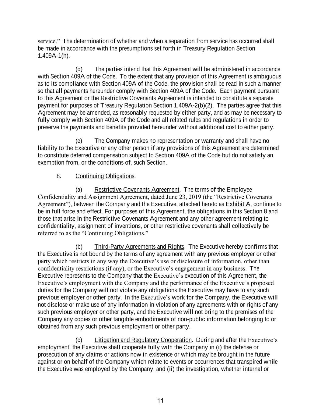 service.” The determination of whether and when a separation from service has occurred shall be made in accordance with the presumptions set forth in Treasury Regulation Section 1.409A-1(h). (d) The parties intend that this Agreement will be administered in accordance with Section 409A of the Code. To the extent that any provision of this Agreement is ambiguous as to its compliance with Section 409A of the Code, the provision shall be read in such a manner so that all payments hereunder comply with Section 409A of the Code. Each payment pursuant to this Agreement or the Restrictive Covenants Agreement is intended to constitute a separate payment for purposes of Treasury Regulation Section 1.409A-2(b)(2). The parties agree that this Agreement may be amended, as reasonably requested by either party, and as may be necessary to fully comply with Section 409A of the Code and all related rules and regulations in order to preserve the payments and benefits provided hereunder without additional cost to either party. (e) The Company makes no representation or warranty and shall have no liability to the Executive or any other person if any provisions of this Agreement are determined to constitute deferred compensation subject to Section 409A of the Code but do not satisfy an exemption from, or the conditions of, such Section. 8. Continuing Obligations. (a) Restrictive Covenants Agreement. The terms of the Employee Confidentiality and Assignment Agreement, dated June 23, 2019 (the “Restrictive Covenants Agreement”), between the Company and the Executive, attached hereto as Exhibit A, continue to be in full force and effect. For purposes of this Agreement, the obligations in this Section 8 and those that arise in the Restrictive Covenants Agreement and any other agreement relating to confidentiality, assignment of inventions, or other restrictive covenants shall collectively be referred to as the “Continuing Obligations.” (b) Third-Party Agreements and Rights. The Executive hereby confirms that the Executive is not bound by the terms of any agreement with any previous employer or other party which restricts in any way the Executive’s use or disclosure of information, other than confidentiality restrictions (if any), or the Executive’s engagement in any business. The Executive represents to the Company that the Executive’s execution of this Agreement, the Executive’s employment with the Company and the performance of the Executive’s proposed duties for the Company will not violate any obligations the Executive may have to any such previous employer or other party. In the Executive’s work for the Company, the Executive will not disclose or make use of any information in violation of any agreements with or rights of any such previous employer or other party, and the Executive will not bring to the premises of the Company any copies or other tangible embodiments of non-public information belonging to or obtained from any such previous employment or other party. (c) Litigation and Regulatory Cooperation. During and after the Executive’s employment, the Executive shall cooperate fully with the Company in (i) the defense or prosecution of any claims or actions now in existence or which may be brought in the future against or on behalf of the Company which relate to events or occurrences that transpired while the Executive was employed by the Company, and (ii) the investigation, whether internal or 11