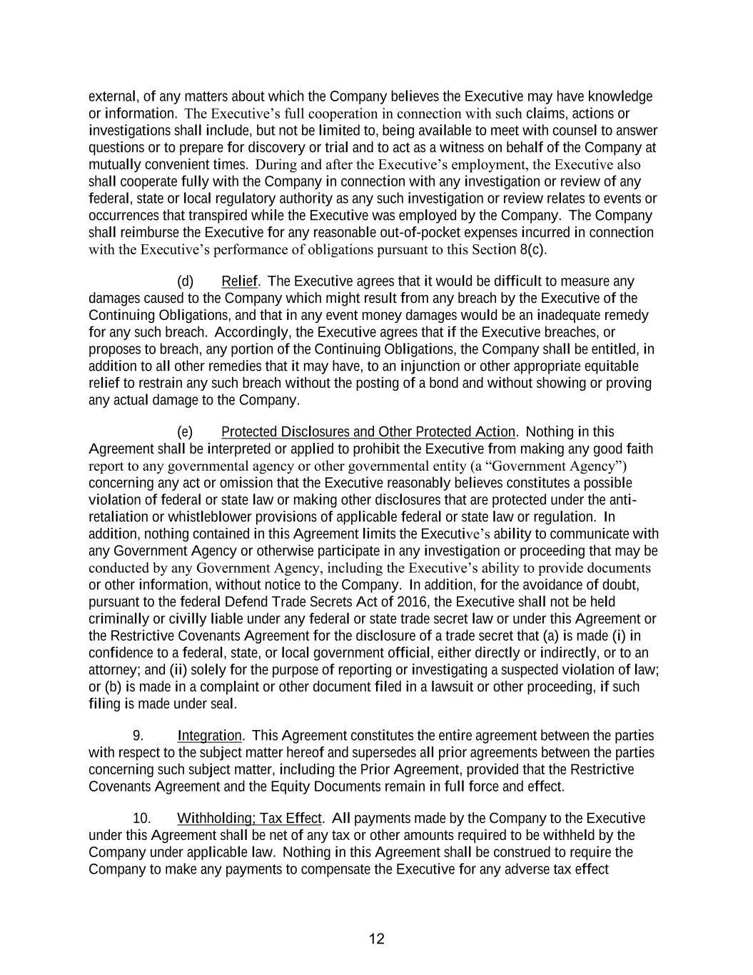 external, of any matters about which the Company believes the Executive may have knowledge or information. The Executive’s full cooperation in connection with such claims, actions or investigations shall include, but not be limited to, being available to meet with counsel to answer questions or to prepare for discovery or trial and to act as a witness on behalf of the Company at mutually convenient times. During and after the Executive’s employment, the Executive also shall cooperate fully with the Company in connection with any investigation or review of any federal, state or local regulatory authority as any such investigation or review relates to events or occurrences that transpired while the Executive was employed by the Company. The Company shall reimburse the Executive for any reasonable out-of-pocket expenses incurred in connection with the Executive’s performance of obligations pursuant to this Section 8(c). (d) Relief. The Executive agrees that it would be difficult to measure any damages caused to the Company which might result from any breach by the Executive of the Continuing Obligations, and that in any event money damages would be an inadequate remedy for any such breach. Accordingly, the Executive agrees that if the Executive breaches, or proposes to breach, any portion of the Continuing Obligations, the Company shall be entitled, in addition to all other remedies that it may have, to an injunction or other appropriate equitable relief to restrain any such breach without the posting of a bond and without showing or proving any actual damage to the Company. (e) Protected Disclosures and Other Protected Action. Nothing in this Agreement shall be interpreted or applied to prohibit the Executive from making any good faith report to any governmental agency or other governmental entity (a “Government Agency”) concerning any act or omission that the Executive reasonably believes constitutes a possible violation of federal or state law or making other disclosures that are protected under the anti- retaliation or whistleblower provisions of applicable federal or state law or regulation. In addition, nothing contained in this Agreement limits the Executive’s ability to communicate with any Government Agency or otherwise participate in any investigation or proceeding that may be conducted by any Government Agency, including the Executive’s ability to provide documents or other information, without notice to the Company. In addition, for the avoidance of doubt, pursuant to the federal Defend Trade Secrets Act of 2016, the Executive shall not be held criminally or civilly liable under any federal or state trade secret law or under this Agreement or the Restrictive Covenants Agreement for the disclosure of a trade secret that (a) is made (i) in confidence to a federal, state, or local government official, either directly or indirectly, or to an attorney; and (ii) solely for the purpose of reporting or investigating a suspected violation of law; or (b) is made in a complaint or other document filed in a lawsuit or other proceeding, if such filing is made under seal. 9. Integration. This Agreement constitutes the entire agreement between the parties with respect to the subject matter hereof and supersedes all prior agreements between the parties concerning such subject matter, including the Prior Agreement, provided that the Restrictive Covenants Agreement and the Equity Documents remain in full force and effect. 10. Withholding; Tax Effect. All payments made by the Company to the Executive under this Agreement shall be net of any tax or other amounts required to be withheld by the Company under applicable law. Nothing in this Agreement shall be construed to require the Company to make any payments to compensate the Executive for any adverse tax effect 12
