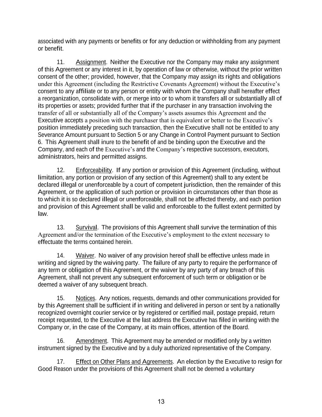 associated with any payments or benefits or for any deduction or withholding from any payment or benefit. 11. Assignment. Neither the Executive nor the Company may make any assignment of this Agreement or any interest in it, by operation of law or otherwise, without the prior written consent of the other; provided, however, that the Company may assign its rights and obligations under this Agreement (including the Restrictive Covenants Agreement) without the Executive’s consent to any affiliate or to any person or entity with whom the Company shall hereafter effect a reorganization, consolidate with, or merge into or to whom it transfers all or substantially all of its properties or assets; provided further that if the purchaser in any transaction involving the transfer of all or substantially all of the Company’s assets assumes this Agreement and the Executive accepts a position with the purchaser that is equivalent or better to the Executive’s position immediately preceding such transaction, then the Executive shall not be entitled to any Severance Amount pursuant to Section 5 or any Change in Control Payment pursuant to Section 6. This Agreement shall inure to the benefit of and be binding upon the Executive and the Company, and each of the Executive’s and the Company’s respective successors, executors, administrators, heirs and permitted assigns. 12. Enforceability. If any portion or provision of this Agreement (including, without limitation, any portion or provision of any section of this Agreement) shall to any extent be declared illegal or unenforceable by a court of competent jurisdiction, then the remainder of this Agreement, or the application of such portion or provision in circumstances other than those as to which it is so declared illegal or unenforceable, shall not be affected thereby, and each portion and provision of this Agreement shall be valid and enforceable to the fullest extent permitted by law. 13. Survival. The provisions of this Agreement shall survive the termination of this Agreement and/or the termination of the Executive’s employment to the extent necessary to effectuate the terms contained herein. 14. Waiver. No waiver of any provision hereof shall be effective unless made in writing and signed by the waiving party. The failure of any party to require the performance of any term or obligation of this Agreement, or the waiver by any party of any breach of this Agreement, shall not prevent any subsequent enforcement of such term or obligation or be deemed a waiver of any subsequent breach. 15. Notices. Any notices, requests, demands and other communications provided for by this Agreement shall be sufficient if in writing and delivered in person or sent by a nationally recognized overnight courier service or by registered or certified mail, postage prepaid, return receipt requested, to the Executive at the last address the Executive has filed in writing with the Company or, in the case of the Company, at its main offices, attention of the Board. 16. Amendment. This Agreement may be amended or modified only by a written instrument signed by the Executive and by a duly authorized representative of the Company. 17. Effect on Other Plans and Agreements. An election by the Executive to resign for Good Reason under the provisions of this Agreement shall not be deemed a voluntary 13