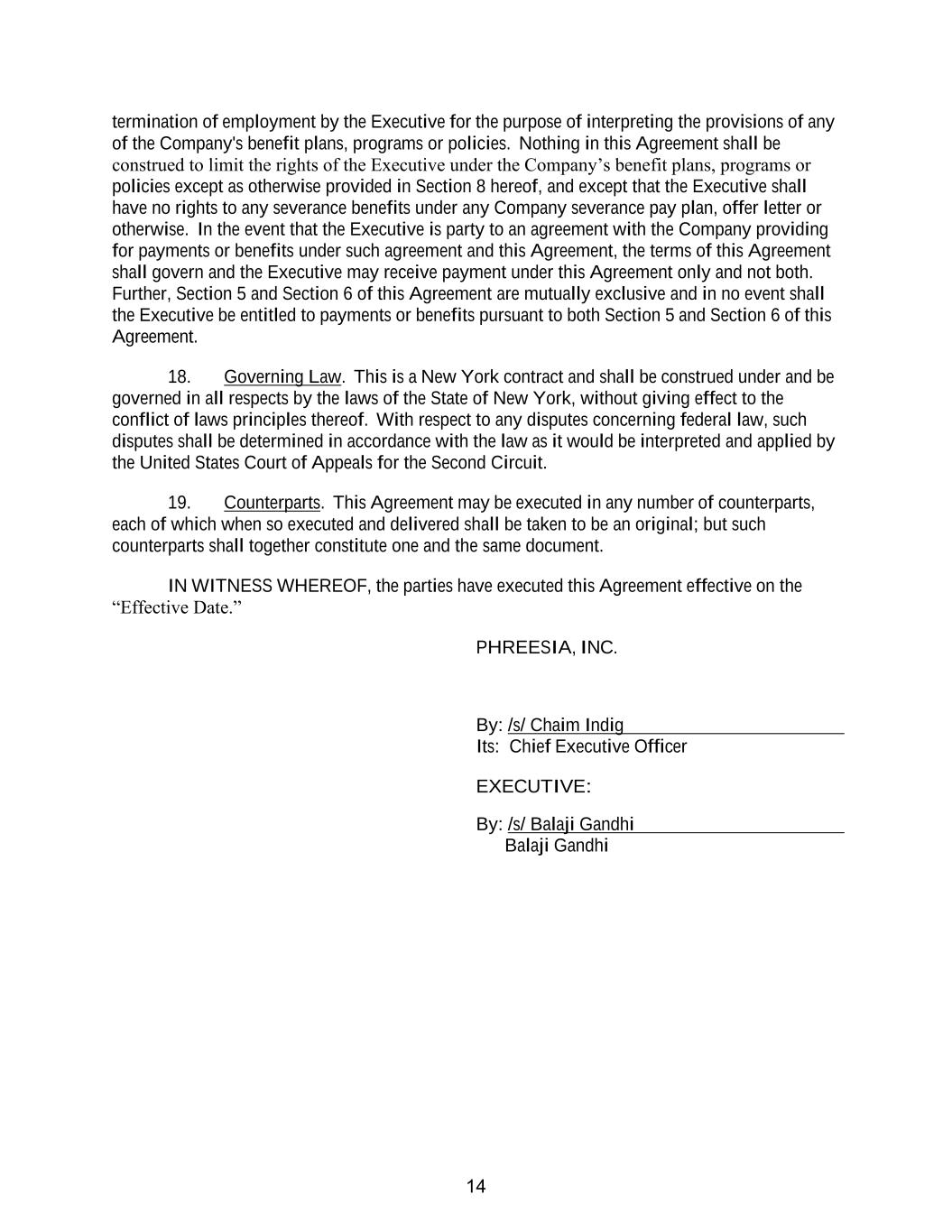 termination of employment by the Executive for the purpose of interpreting the provisions of any of the Company's benefit plans, programs or policies. Nothing in this Agreement shall be construed to limit the rights of the Executive under the Company’s benefit plans, programs or policies except as otherwise provided in Section 8 hereof, and except that the Executive shall have no rights to any severance benefits under any Company severance pay plan, offer letter or otherwise. In the event that the Executive is party to an agreement with the Company providing for payments or benefits under such agreement and this Agreement, the terms of this Agreement shall govern and the Executive may receive payment under this Agreement only and not both. Further, Section 5 and Section 6 of this Agreement are mutually exclusive and in no event shall the Executive be entitled to payments or benefits pursuant to both Section 5 and Section 6 of this Agreement. 18. Governing Law. This is a New York contract and shall be construed under and be governed in all respects by the laws of the State of New York, without giving effect to the conflict of laws principles thereof. With respect to any disputes concerning federal law, such disputes shall be determined in accordance with the law as it would be interpreted and applied by the United States Court of Appeals for the Second Circuit. 19. Counterparts. This Agreement may be executed in any number of counterparts, each of which when so executed and delivered shall be taken to be an original; but such counterparts shall together constitute one and the same document. IN WITNESS WHEREOF, the parties have executed this Agreement effective on the “Effective Date.” PHREESIA, INC. By: /s/ Chaim Indig Its: Chief Executive Officer EXECUTIVE: By: /s/ Balaji Gandhi Balaji Gandhi 14