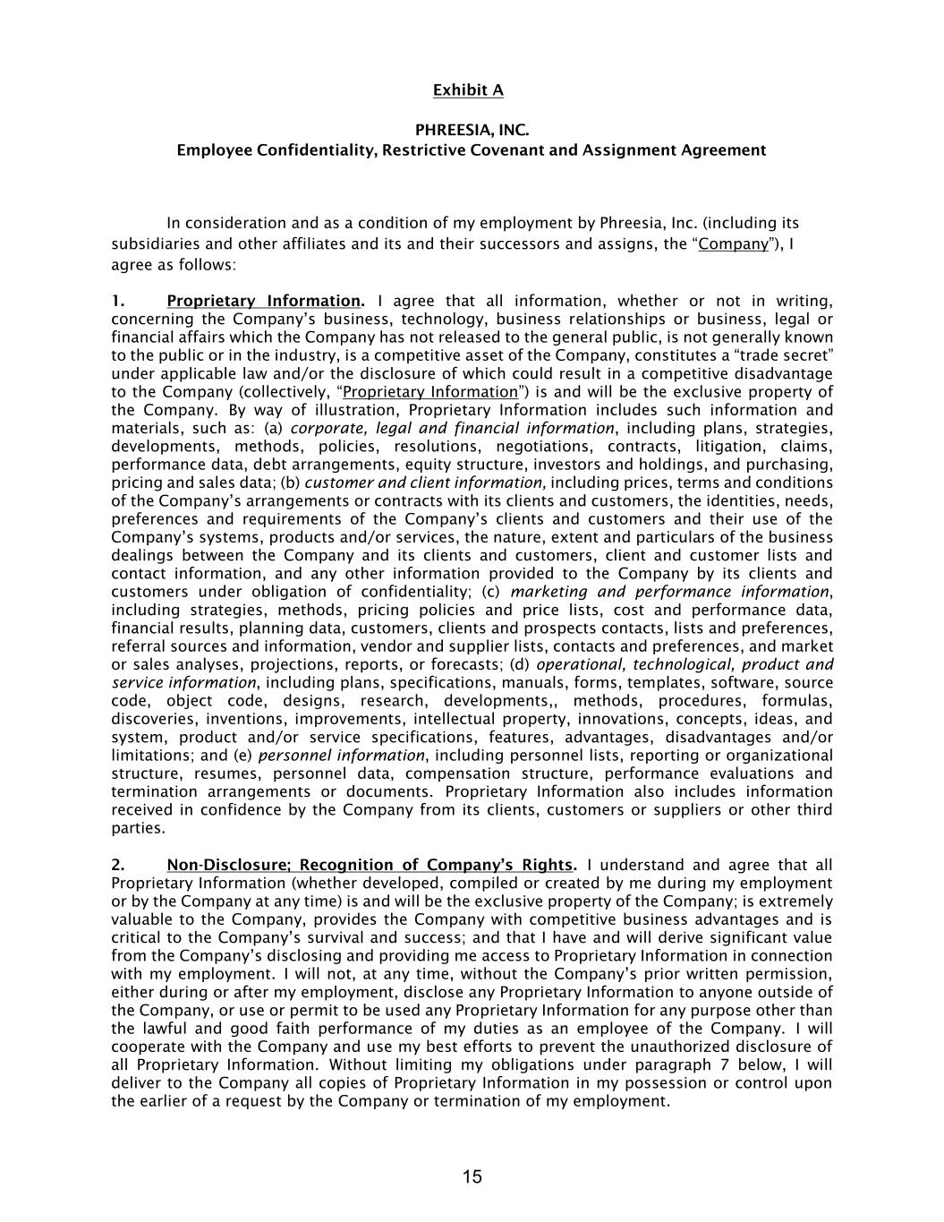 DocuSign Envelope ID: 013699B5-EA8E-4103-95BE-1461AC129709 PHREESIA, INC. Employee Confidentiality, Restrictive Covenant and Assignment Agreement In consideration and as a condition of my employment by Phreesia, Inc. (including its subsidiaries and other affiliates and its and their successors and assigns, the “Company”), I agree as follows: 1. Proprietary Information. I agree that all information, whether or not in writing, concerning the Company’s business, technology, business relationships or business, legal or financial affairs which the Company has not released to the general public, is not generally known to the public or in the industry, is a competitive asset of the Company, constitutes a “trade secret” under applicable law and/or the disclosure of which could result in a competitive disadvantage to the Company (collectively, “Proprietary Information”) is and will be the exclusive property of the Company. By way of illustration, Proprietary Information includes such information and materials, such as: (a) corporate, legal and financial information, including plans, strategies, developments, methods, policies, resolutions, negotiations, contracts, litigation, claims, performance data, debt arrangements, equity structure, investors and holdings, and purchasing, pricing and sales data; (b) customer and client information, including prices, terms and conditions of the Company’s arrangements or contracts with its clients and customers, the identities, needs, preferences and requirements of the Company’s clients and customers and their use of the Company’s systems, products and/or services, the nature, extent and particulars of the business dealings between the Company and its clients and customers, client and customer lists and contact information, and any other information provided to the Company by its clients and customers under obligation of confidentiality; (c) marketing and performance information, including strategies, methods, pricing policies and price lists, cost and performance data, financial results, planning data, customers, clients and prospects contacts, lists and preferences, referral sources and information, vendor and supplier lists, contacts and preferences, and market or sales analyses, projections, reports, or forecasts; (d) operational, technological, product and service information, including plans, specifications, manuals, forms, templates, software, source code, object code, designs, research, developments,, methods, procedures, formulas, discoveries, inventions, improvements, intellectual property, innovations, concepts, ideas, and system, product and/or service specifications, features, advantages, disadvantages and/or limitations; and (e) personnel information, including personnel lists, reporting or organizational structure, resumes, personnel data, compensation structure, performance evaluations and termination arrangements or documents. Proprietary Information also includes information received in confidence by the Company from its clients, customers or suppliers or other third parties. 2. Non-Disclosure; Recognition of Company’s Rights. I understand and agree that all Proprietary Information (whether developed, compiled or created by me during my employment or by the Company at any time) is and will be the exclusive property of the Company; is extremely valuable to the Company, provides the Company with competitive business advantages and is critical to the Company’s survival and success; and that I have and will derive significant value from the Company’s disclosing and providing me access to Proprietary Information in connection with my employment. I will not, at any time, without the Company’s prior written permission, either during or after my employment, disclose any Proprietary Information to anyone outside of the Company, or use or permit to be used any Proprietary Information for any purpose other than the lawful and good faith performance of my duties as an employee of the Company. I will cooperate with the Company and use my best efforts to prevent the unauthorized disclosure of all Proprietary Information. Without limiting my obligations under paragraph 7 below, I will deliver to the Company all copies of Proprietary Information in my possession or control upon the earlier of a request by the Company or termination of my employment. 15 Exhibit A